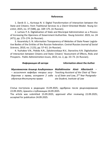 1. Даник О.Л. Цифровая трансформация взаимодействия государства и граждан: от традиционных сервисов к клиентоцентричной модели / О.Л. Даник, Н.В. Куриная // Молодой ученый. - 2025. - № 37 (588). - С. 169-175. EDN: LEFXNF
