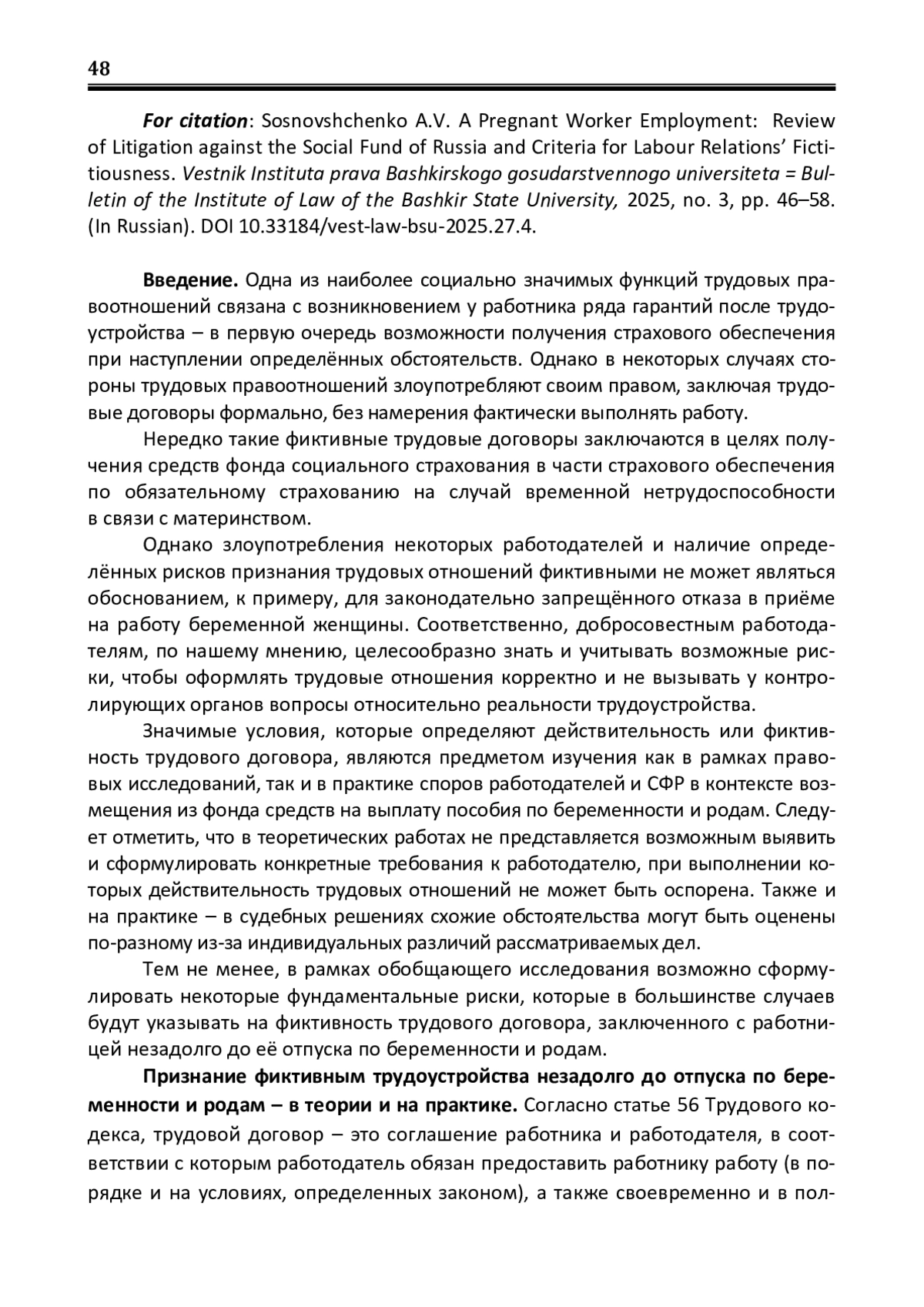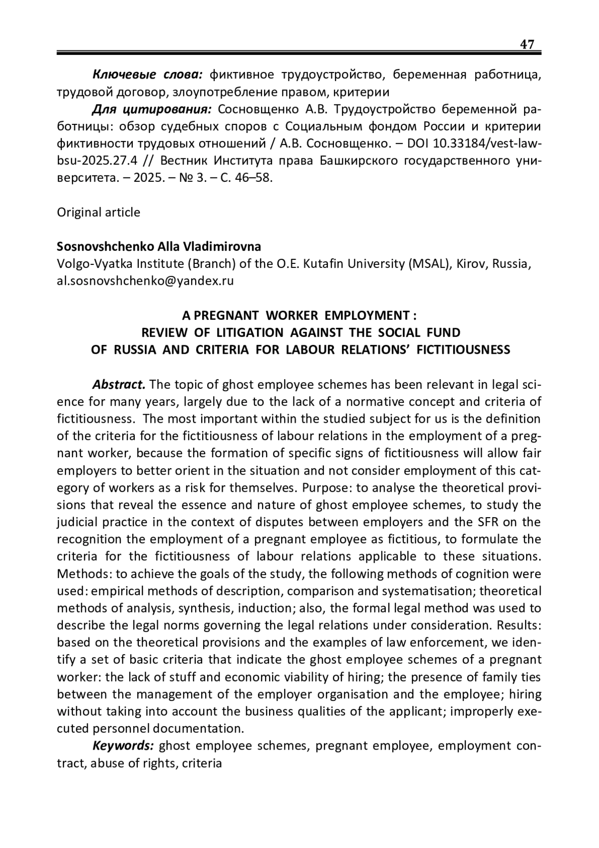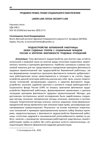 Тема фиктивного трудоустройства уже многие годы остаётся актуальной в правовой науке во многом ввиду отсутствия нормативно закреплённого понятия и критериев фиктивности. Наиболее значимым в рамках изучаемой тематики для нас представляется определение критериев фиктивности трудовых правоотношений при трудоустройстве беременной работницы, так как формирование конкретных признаков фиктивности позволит добросовестным работодателям лучше ориентироваться в ситуации и не считать трудоустройство данной категории работниц риском для себя. Цель: анализ теоретических положений, раскрывающих сущность и характер фиктивного трудоустройства, изучение судебной практики в контексте споров работодателей и Социального фонда России (СФР) по вопросу признания фиктивным трудоустройства беременной работницы, формулирование применимых к данным ситуациям критериев фиктивности трудовых правоотношений. Методы: для достижения поставленных целей исследования были задействованы следующие методы познания: эмпирические методы описания, сравнения и систематизации; теоретические методы анализа, синтеза, индукции; также формальноюридический метод применялся при описании норм права, регулирующих рассматриваемые правоотношения. Результаты: на основе изученных теоретических положений и примеров правоприменения выявлен набор базовых критериев, свидетельствующих о фиктивности трудоустройства беременной работницы: отсутствие кадровой и экономической целесообразности приёма на работу; наличие у руководства организации-работодателя родственных связей с работницей; приём на работу без учёта деловых качеств соискательницы; ненадлежащим образом оформленная кадровая документация