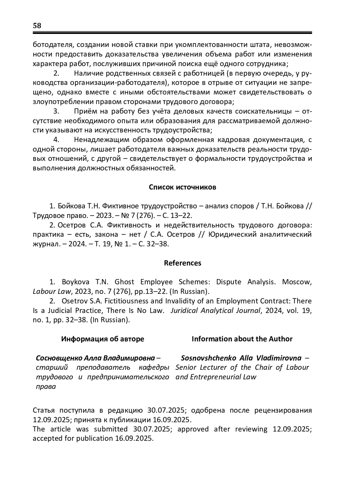 1. Бойкова Т.Н. Фиктивное трудоустройство - анализ споров / Т.Н. Бойкова // Трудовое право. - 2023. - № 7 (276). - С. 13-22.