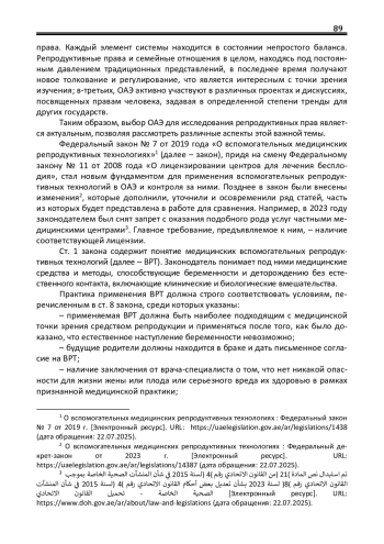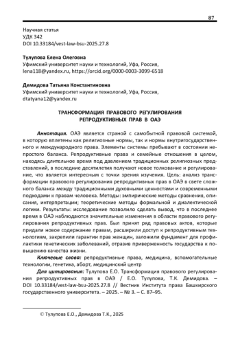 ОАЭ является страной с самобытной правовой системой, в которую вплетены как религиозные нормы, так и нормы внутригосударственного и международного права. Элементы системы пребывают в состоянии непростого баланса. Репродуктивные права и семейные отношения в целом, находясь длительное время под давлением традиционных религиозных представлений, в последние десятилетия получают новое толкование и регулирование, что является интересным с точки зрения изучения. Цель: анализ трансформации правового регулирования репродуктивных прав в ОАЭ в свете сложного баланса между традиционными духовными ценностями и современными подходами к правам человека. Методы: эмпирические методы сравнения, описания, интерпретации; теоретические методы формальной и диалектической логики. Результаты: исследование позволило сделать вывод, что в последнее время в ОАЭ наблюдаются значительные изменения в области правового регулирования репродуктивных прав. Был принят ряд правовых актов, которые придали новое содержание правам, расширили доступ к репродуктивным технологиям, закрепили гарантии прав женщин, заложили фундамент для профилактики генетических заболеваний, отразив приверженность государства к повышению качества жизни