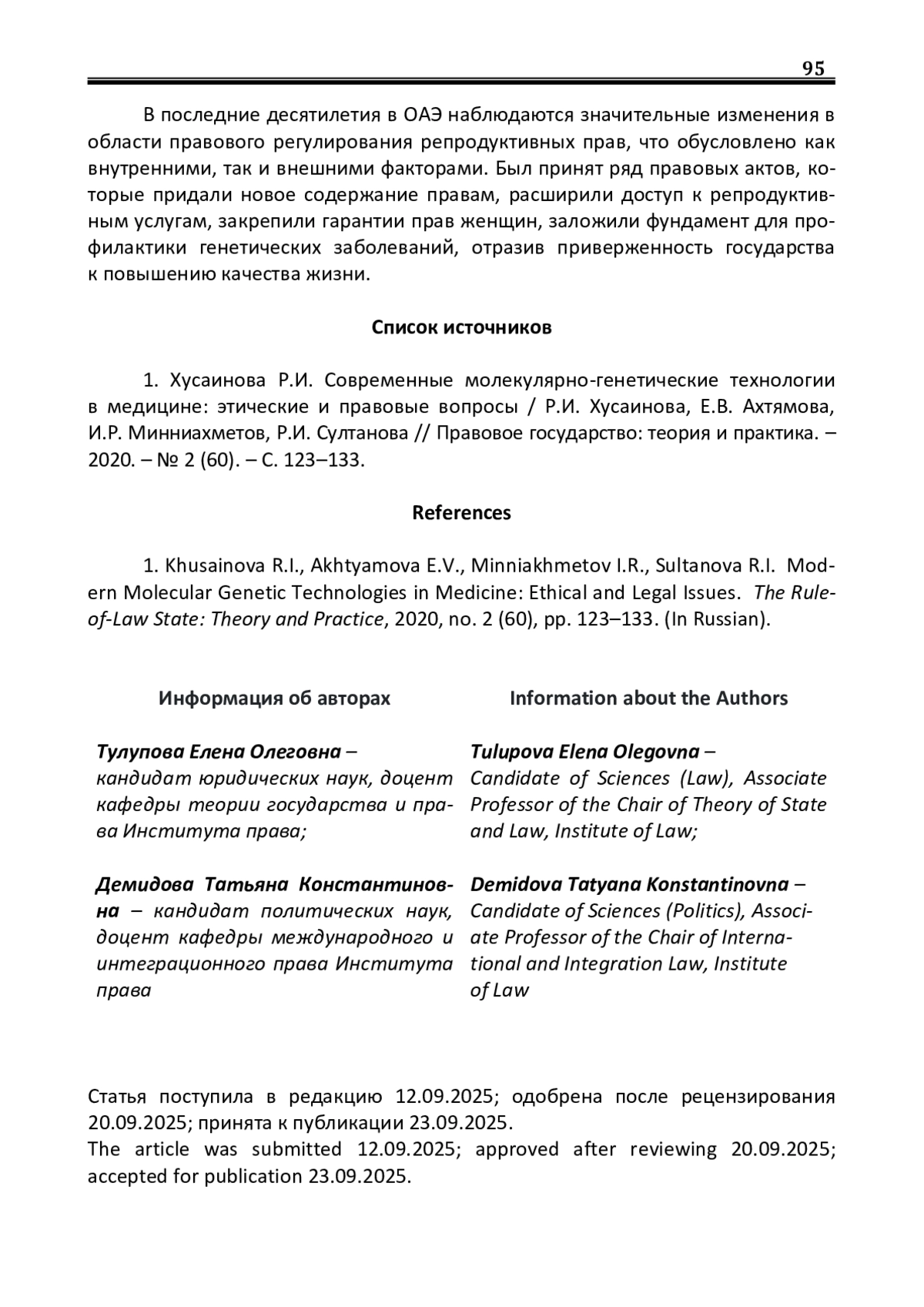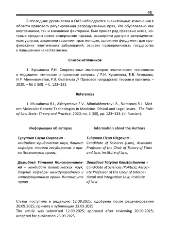 1. Хусаинова Р.И. Современные молекулярно-генетические технологии в медицине: этические и правовые вопросы / Р.И. Хусаинова, Е.В. Ахтямова, И.Р. Минниахметов, Р.И. Султанова // Правовое государство: теория и практика. - 2020. - № 2 (60). - С. 123-133. EDN: VBFZFB