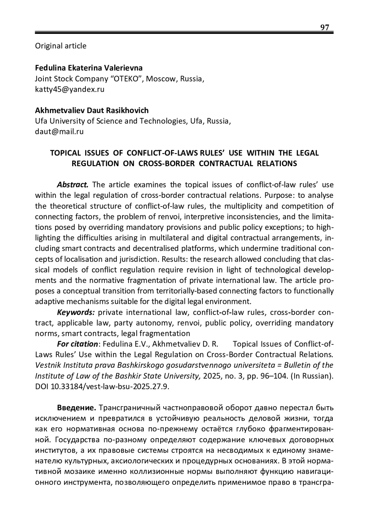 В статье рассматриваются актуальные проблемы применения коллизионных норм права в рамках правового регулирования транснациональных договорных отношений. Цель: анализ теоретической структуры коллизионных норм, исследование множественности и конкуренции связующих факторов, проблеме обратных отсылок, несоответствия в толковании и ограничения, связанные с преобладанием обязательных положений и исключений из государственной политики; акцентирование внимания на трудностях, возникающих в рамках многосторонних и цифровых договорных механизмов, включая смарт-контракты и децентрализованные платформы, которые подрывают традиционные концепции локализации и юрисдикции. Результаты: исследование позволило прийти к выводу о том, что классические модели урегулирования конфликтов требуют пересмотра в свете технологических достижений и нормативной фрагментации международного частного права. В статье предлагается концептуальный переход от территориально обусловленных связующих факторов к функционально адаптивным механизмам, подходящим для цифровой правовой среды.