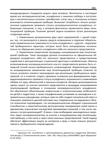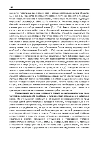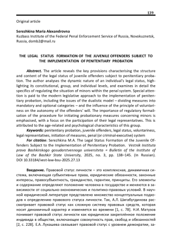 В статье раскрываются ключевые положения, характеризующие структуру и содержание правового статуса несовершеннолетних осуждённых, в отношении которых применяется пенитенциарная пробация. Автор анализирует динамическую природу правового статуса личности, выделяя его конституционный, групповой и индивидуальный уровни, а также подробно рассматривает особенности регулирования положения несовершеннолетних в уголовно-исполнительной системе. Особое внимание уделяется современному законодательному подходу к реализации пенитенциарной пробации, включая проблемы дуалистической модели – разделения мероприятий на обязательные и факультативные, а также влиянию принципа добровольности на автономию воли осуждённых. Подчёркивается важность нормативной формализации процедуры инициирования пробационных мер в отношении несовершеннолетних с акцентом на участие их законных представителей, что обусловлено возрастными и психологическими особенностями данной категории лиц