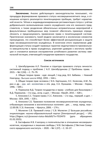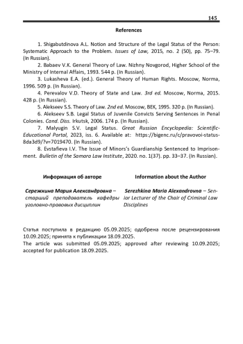 6. Алексеев С.Б. Правовое положение несовершеннолетних осужденных, отбывающих наказание в воспитательных колониях: дис. … канд. юрид. наук: 12.00.08 / С.Б. Алексеев. - Иркутск, 2006. - 174 с. EDN: NNXQUJ