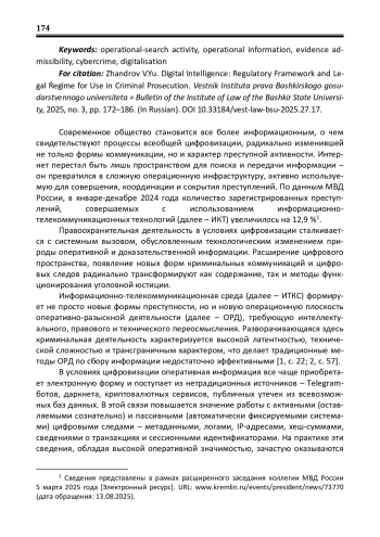 Современное общество становится все более информационным, о чем свидетельствуют процессы всеобщей цифровизации, радикально изменившей не только формы коммуникации, но и характер преступной активности. Интернет перестал быть лишь пространством для поиска и передачи информации – он превратился в сложную операционную инфраструктуру, активно используемую для совершения, координации и сокрытия преступлений. По данным МВД России, в январе-декабре 2024 года количество зарегистрированных преступлений, совершаемых с использованием информационнотелекоммуникационных технологий (далее – ИКТ) увеличилось на 12,9 %1