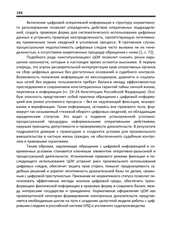 Смещение преступной активности в информационнотелекоммуникационную среду предопределило необходимость адаптации оперативно-разыскной деятельности к новым условиям, в которых техническая грамотность, аналитические способности и умение работать с цифровыми следами становятся важнейшими компетенциями сотрудников ОВД. Складывающиеся условия цифровой трансформации требуют пересмотра как доктринальных, так и прикладных основ оперативно-разыскной деятельности и, прежде всего, работы с представляющей оперативный интерес цифровой информацией. Цель: сформировать систему аргументов признания цифровой оперативной информации самостоятельным объектом правового регулирования и заслуживающей установления специального режима ее документирования. Методы: сравнительно-правовой, доктринального толкования норм оперативноразыскного и уголовно-процессуального законодательства, изучения судебных решений по уголовным делам, синтеза, формальной и диалектической логики. Результаты: исследование позволило проанализировать международноправовые требования к обработке цифровых следов преступной деятельности, оценить законодательный опыт западноевропейских государств по обеспечению допустимости цифровых доказательств, выявить противоречия российской судебной практики по признанию процессуально значимой полученной оперативным путем цифровой информации. Делается вывод, что российское оперативно-разыскное законодательство нуждается в формализации цифровой оперативной информации как особого рода сведений, извлекаемых оперативными подразделениями из информационно-телекоммуникационной среды, подвергнутых первичной верификации и способных трансформироваться в процессуально допустимые доказательства. Это снизит риски нарушения законности и позволит сформировать общий подход в правоприменительной практике по документированию цифровых следов преступлений
