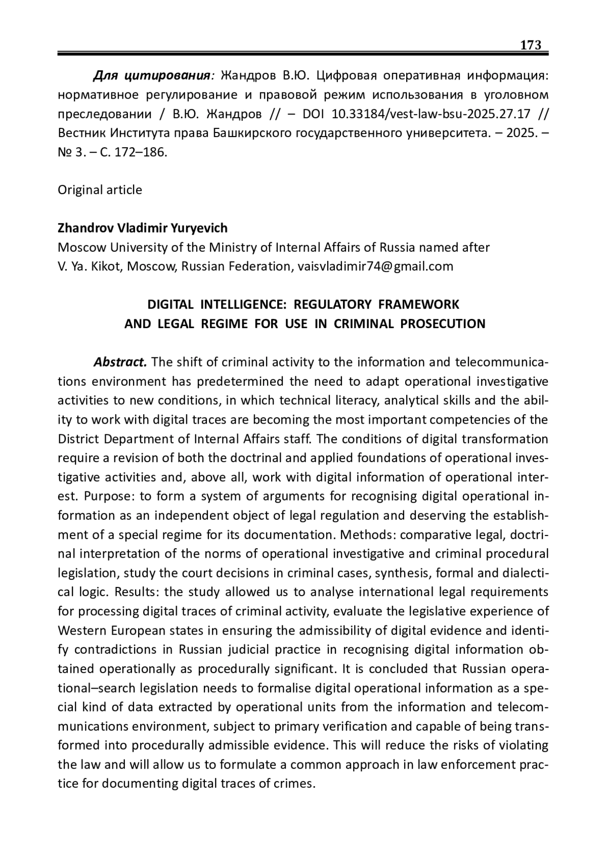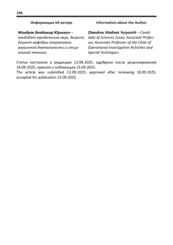2. Жандров В.Ю. Решение задач оперативно-розыскной деятельности посредством получения сведений в информационно-телекоммуникационной среде / В.Ю. Жандров // Вестник Московского университета МВД России. - 2024. - № 4. - С. 56-65.