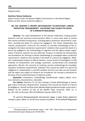 Технологический прорыв и стремительное развитие Российской Федерации, имея положительную динамику и необходимый социальноэкономический эффект, в ряде случаев приводит к пострадавшим с тяжелыми и смертельными последствиями, в том числе по причине нарушений требований охраны труда, повлекших по неосторожности смерть человека. В статье обоснованы предпосылки и критерии создания частной методики расследования нарушений требований охраны труда, повлекших по неосторожности смерть человека, а также методология познания и объектно-предметная организация криминалистического исследования. Цель: выявить предпосылки и основы формирования частной методики расследования нарушений требований охраны труда, повлекших по неосторожности смерть человека. Методы: математический анализ статистических данных официальной статистики, результаты опроса следователей (n=59), методы интерпретации и аналогии, системный, деятельностный и ситуационный подходы. Результаты: обоснована необходимость создания частной методики расследования нарушений требований охраны труда, повлекших по неосторожности смерть человека, выдвинута научная проблема и основная идея, а также рассмотрен объект и предмет исследования, представлено понятие на базе основополагающих закономерностей объективной действительности