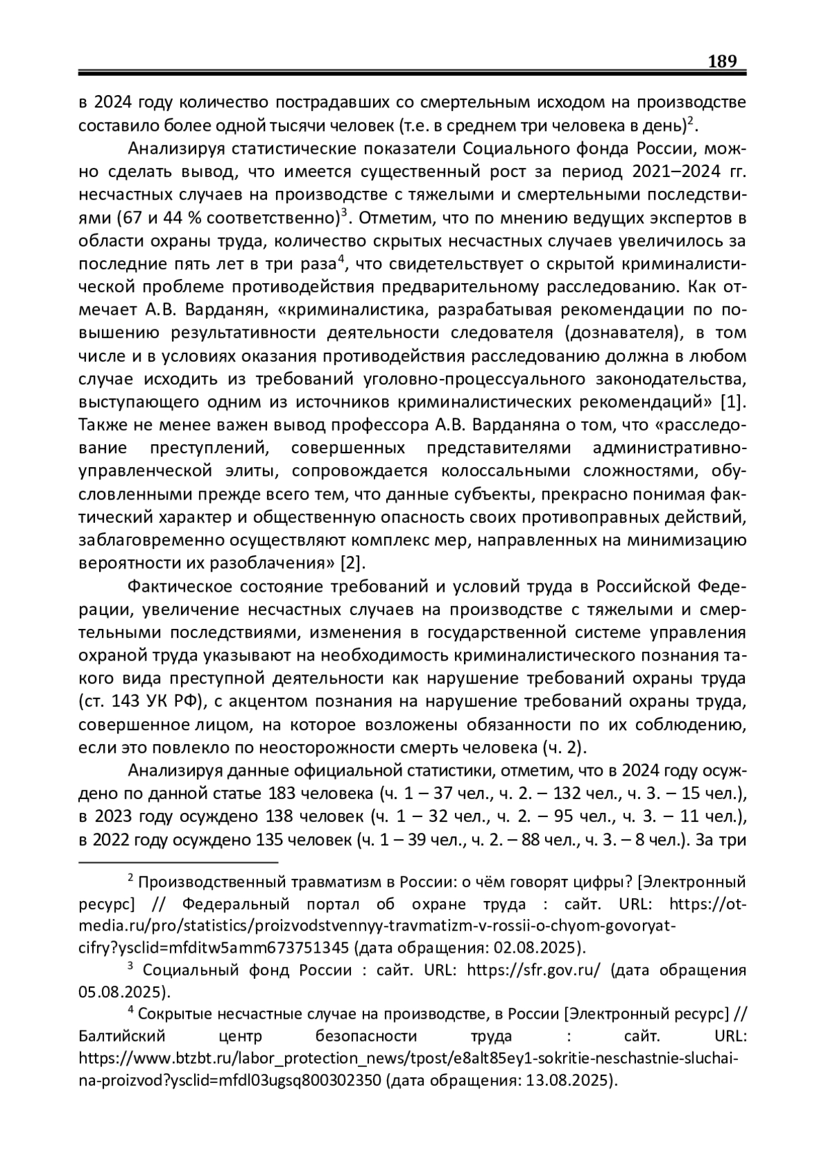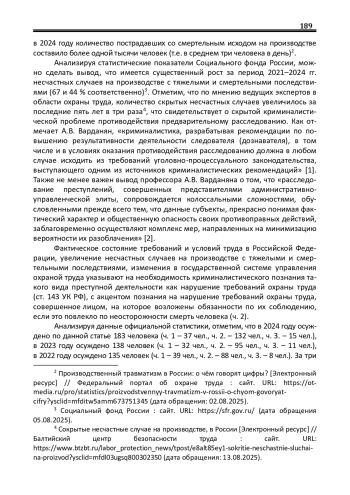 Анализируя статистические показатели Социального фонда России, можно сделать вывод, что имеется существенный рост за период 2021–2024 гг. несчастных случаев на производстве с тяжелыми и смертельными последствиями (67 и 44 % соответственно)32. Отметим, что по мнению ведущих экспертов в области охраны труда, количество скрытых несчастных случаев увеличилось за последние пять лет в три раза43, что свидетельствует о скрытой криминалистической проблеме противодействия предварительному расследованию. Как отмечает А. В. Варданян, «криминалистика, разрабатывая рекомендации по повышению результативности деятельности следователя (дознавателя), в том числе и в условиях оказания противодействия расследованию должна в любом случае исходить из требований уголовно-процессуального законодательства, выступающего одним из источников криминалистических рекомендаций» [1]. Также не менее важен вывод профессора А. В. Варданяна о том, что «расследование преступлений, совершенных представителями административноуправленческой элиты, сопровождается колоссальными сложностями, обусловленными прежде всего тем, что данные субъекты, прекрасно понимая фактический характер и общественную опасность своих противоправных действий, заблаговременно осуществляют комплекс мер, направленных на минимизацию вероятности их разоблачения»