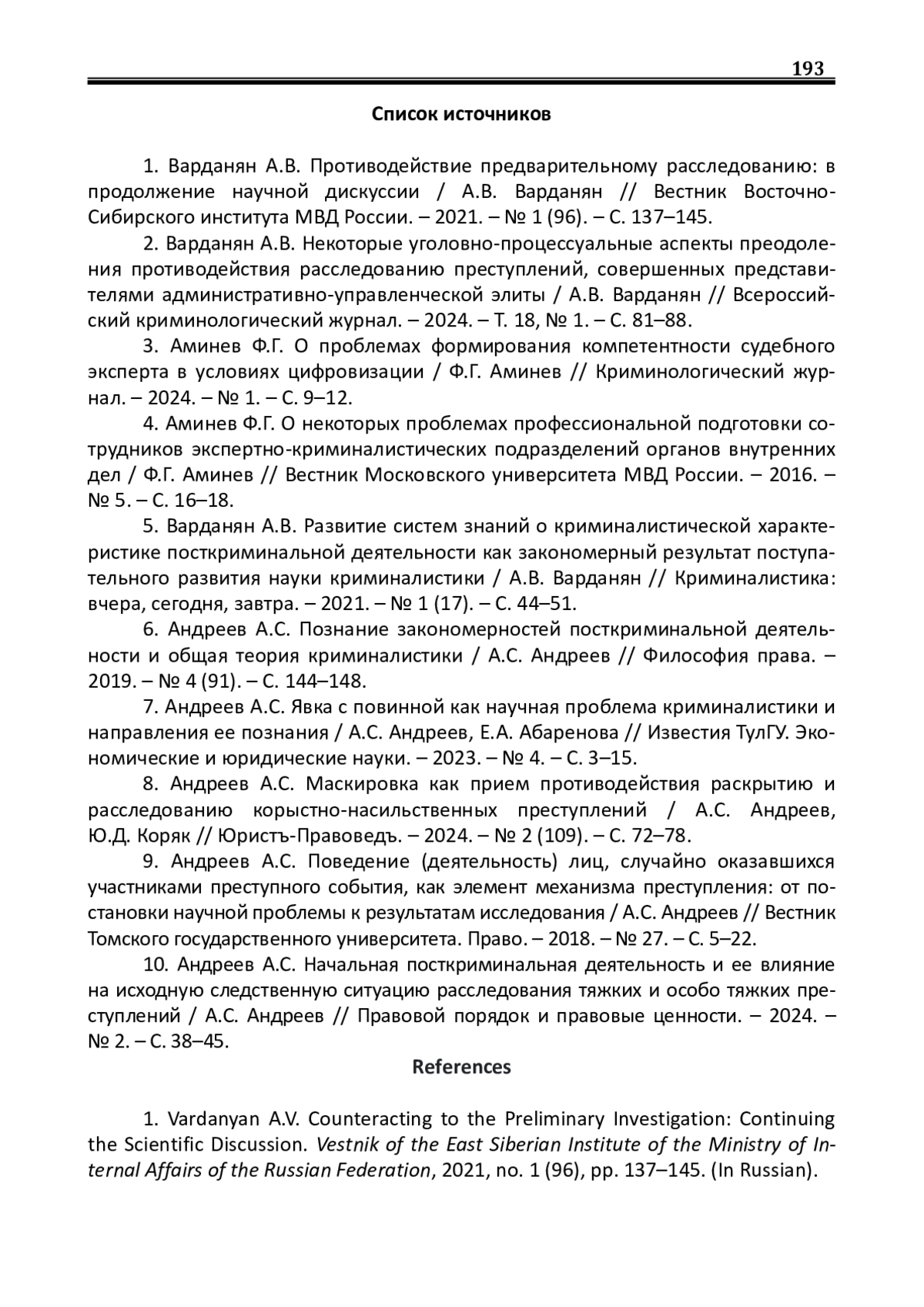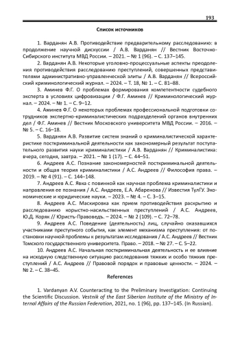 1. Варданян А.В. Противодействие предварительному расследованию: в продолжение научной дискуссии / А.В. Варданян // Вестник Восточно-Сибирского института МВД России. - 2021. - № 1 (96). - С. 137-145.