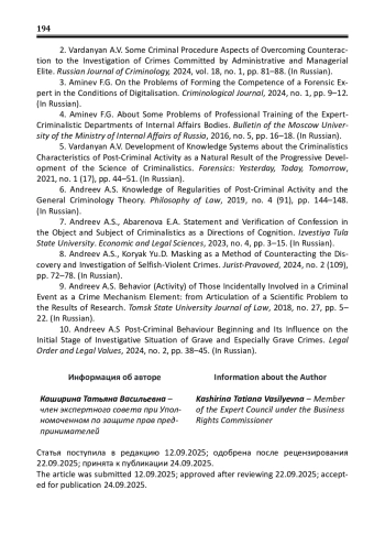 5. Варданян А.В. Развитие систем знаний о криминалистической характеристике посткриминальной деятельности как закономерный результат поступательного развития науки криминалистики / А.В. Варданян // Криминалистика: вчера, сегодня, завтра. - 2021. - № 1 (17). - С. 44-51. EDN: JIXQAQ
