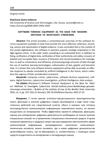 В статье представлен комплексный обзор имеющихся на сегодняшний день программных технико-криминалистических средств, обеспечивающих наиболее эффективное собирание, фиксацию, изъятие и исследование цифровых доказательств. Сделан вывод, что в условиях цифровизации общества рассматриваемое программное обеспечение приобретает стратегическое значение в борьбе с преступлениями в сфере компьютерной информации, обеспечивая в автоматизированном виде помимо фиксации верификацию цифровых данных, проверку их подлинности и сохранности, восстановление удаленных и зашифрованных сведений, выдачу прогнозов и рекомендаций по расследованию, а также удобство и оперативность обработки больших массивов данных за счет использования технологий машинного обучения, распознавания текстовых, графических и биометрических данных. Показано, что только программные технико-криминалистические средства смогут обеспечить эффективное противодействие атакам, управляемым искусственным интеллектом в будущем, что подчеркивает насущность их рассмотрения в настоящее время