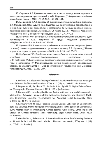 1. Бычков В.В. Электронное следообразование преступной деятельности в сети Интернет / В.В. Бычков // Расследование преступлений: проблемы и пути их решения. - 2020. - № 1 (27). - С. 106-111. EDN: SEQJCE