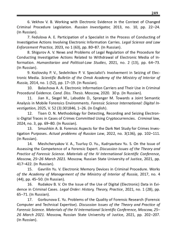 5. Гаврилин Ю.В. Процессуальный порядок собирания доказательств на энергонезависимых локальных электронных носителях информации / Ю.В. Гаврилин, А.А. Балашова // Сибирский юридический вестник. - 2020. - № 2 (89). - С. 77-82. EDN: LLSSCT