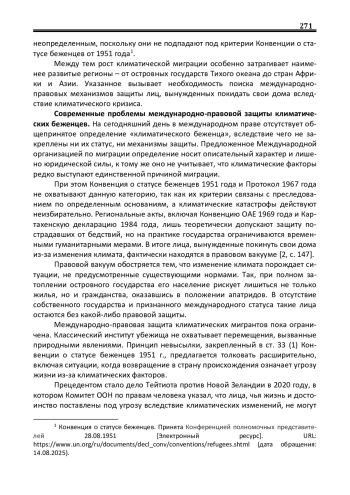 Статья посвящена анализу правового статуса и международно-правовой защиты климатических беженцев, численность которых стремительно растет в условиях глобального изменения климата. В этой связи необходимо рассмотреть причины формирования правового вакуума: отсутствие общепринятого определения, неприменимость Конвенции о статусе беженцев от 1951 года и ограниченность региональных соглашений. Цель: анализ действующих подходов, таких как использование норм права, развитие механизмов «мягкого права», заключение региональных соглашений, а также формирование предложений о создании отдельного международного режима защиты. Методы: исследование выполнено с использованием общенаучных (логический, анализа, синтеза, индукции, дедукции) и частнонаучных (формальноюридический, толкования правовых норм) методов. Результаты: обосновывается необходимость сочетания адаптации существующих норм с формированием новых институтов, а также акцентируется внимание на использовании превентивных мер в рамках международного экологического права
