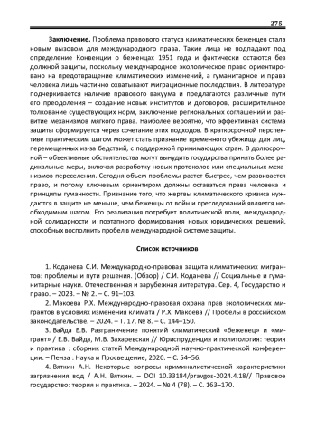 1. Коданева С.И. Международно-правовая защита климатических мигрантов: проблемы и пути решения. (Обзор) / С.И. Коданева // Социальные и гуманитарные науки. Отечественная и зарубежная литература. Сер. 4, Государство и право. - 2023. - № 2. - С. 91-103.