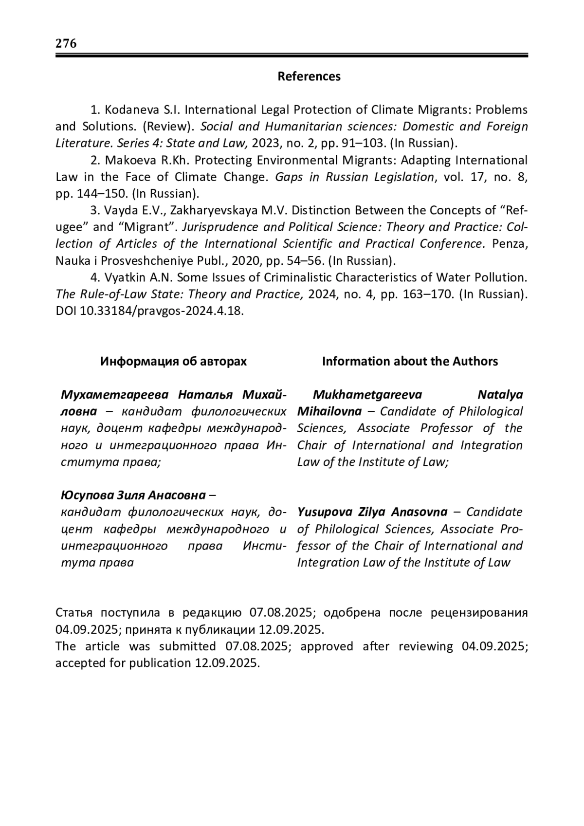 2. Макоева Р.Х. Международно-правовая охрана прав экологических мигрантов в условиях изменения климата / Р.Х. Макоева // Пробелы в российском законодательстве. - 2024. - Т. 17, № 8. - С. 144-150. EDN: NSZBNM