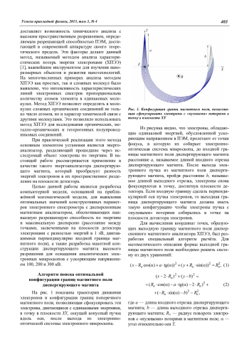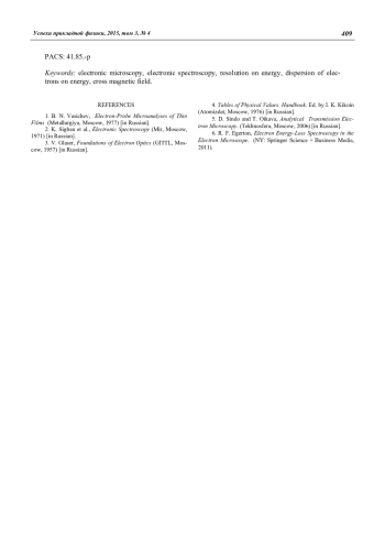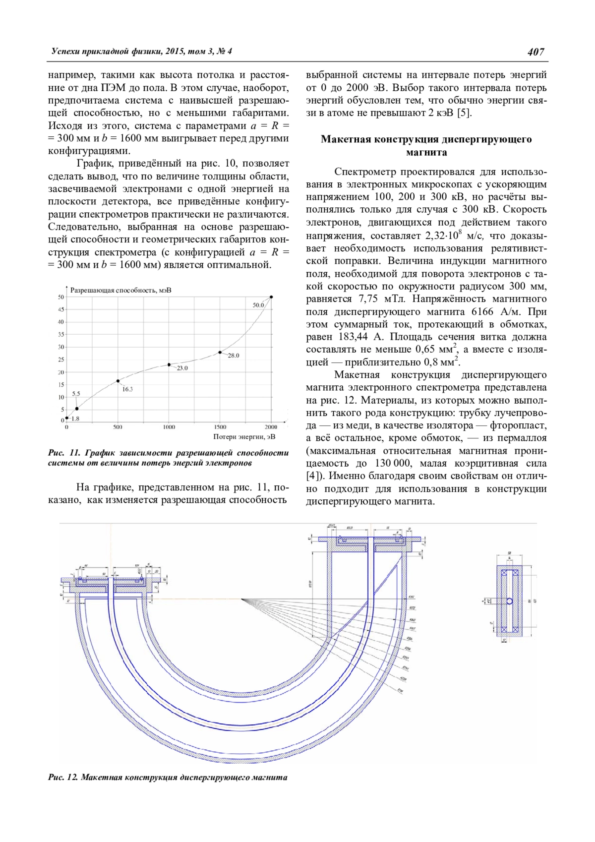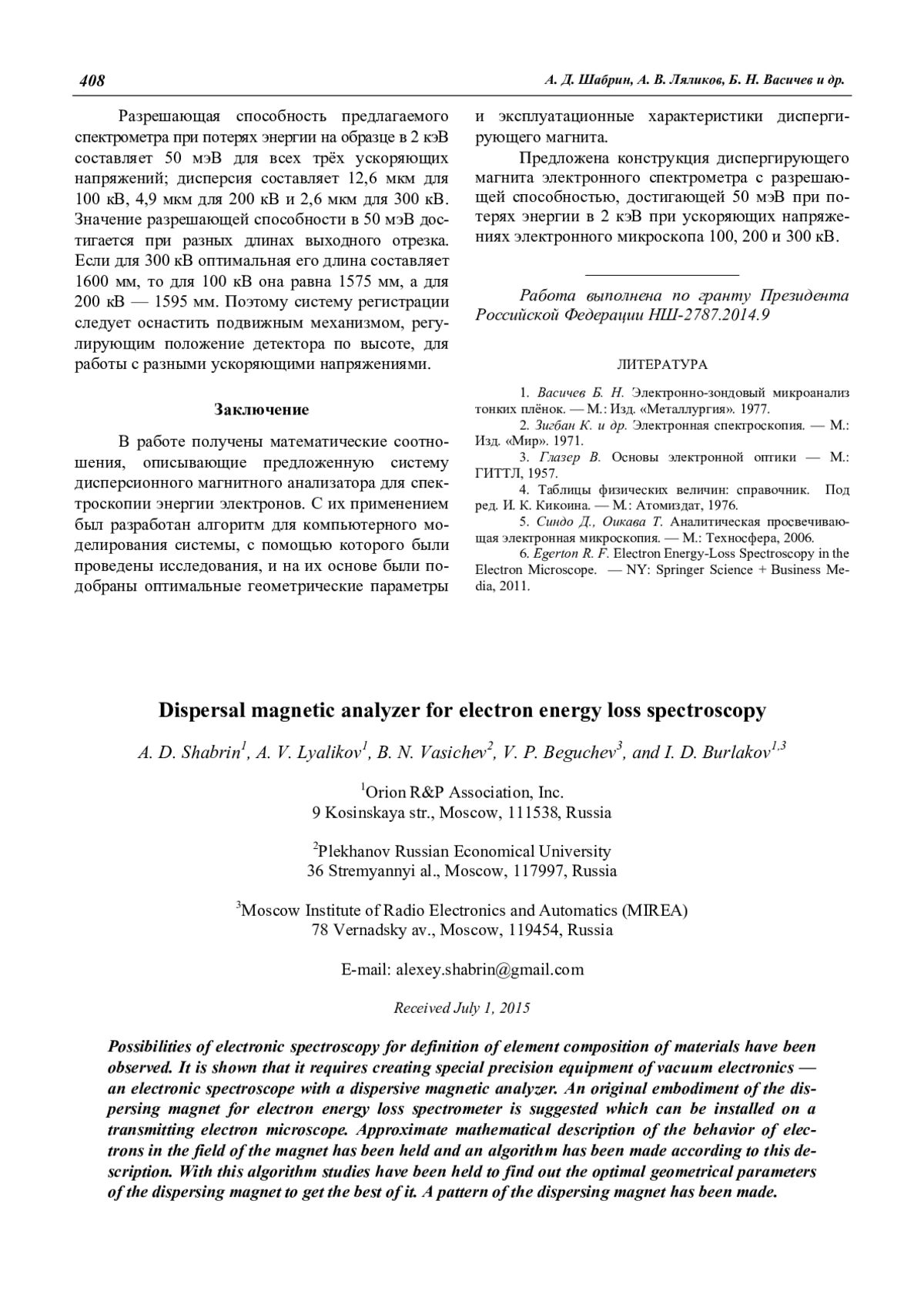 Рассмотрены возможности электронной спектроскопии для определения элементного состава материалов. Показано, что для этого требуется разработка специального прецизионного оборудования вакуумной электроники — электронного спектрометра с дисперсионным магнитным анализатором. Предложен оригинальный вариант устройства диспергирующего магнита для спектрометра потерь энергий электронов, который можно установить на просвечивающие электронные микроскопы. Проведено приближённое математическое описание поведения электронов при взаимодействии с полем магнита, и составлен алгоритм, построенный на полученном описании. С помощью этого алгоритма проведены исследования с целью подбора оптимальных геометрических и конструктивных параметров системы, чтобы добиться наилучших результатов её работы. Предложена макетная конструкция диспергирующего магнита спектрометра.