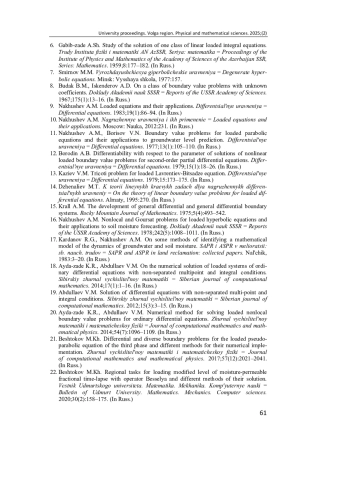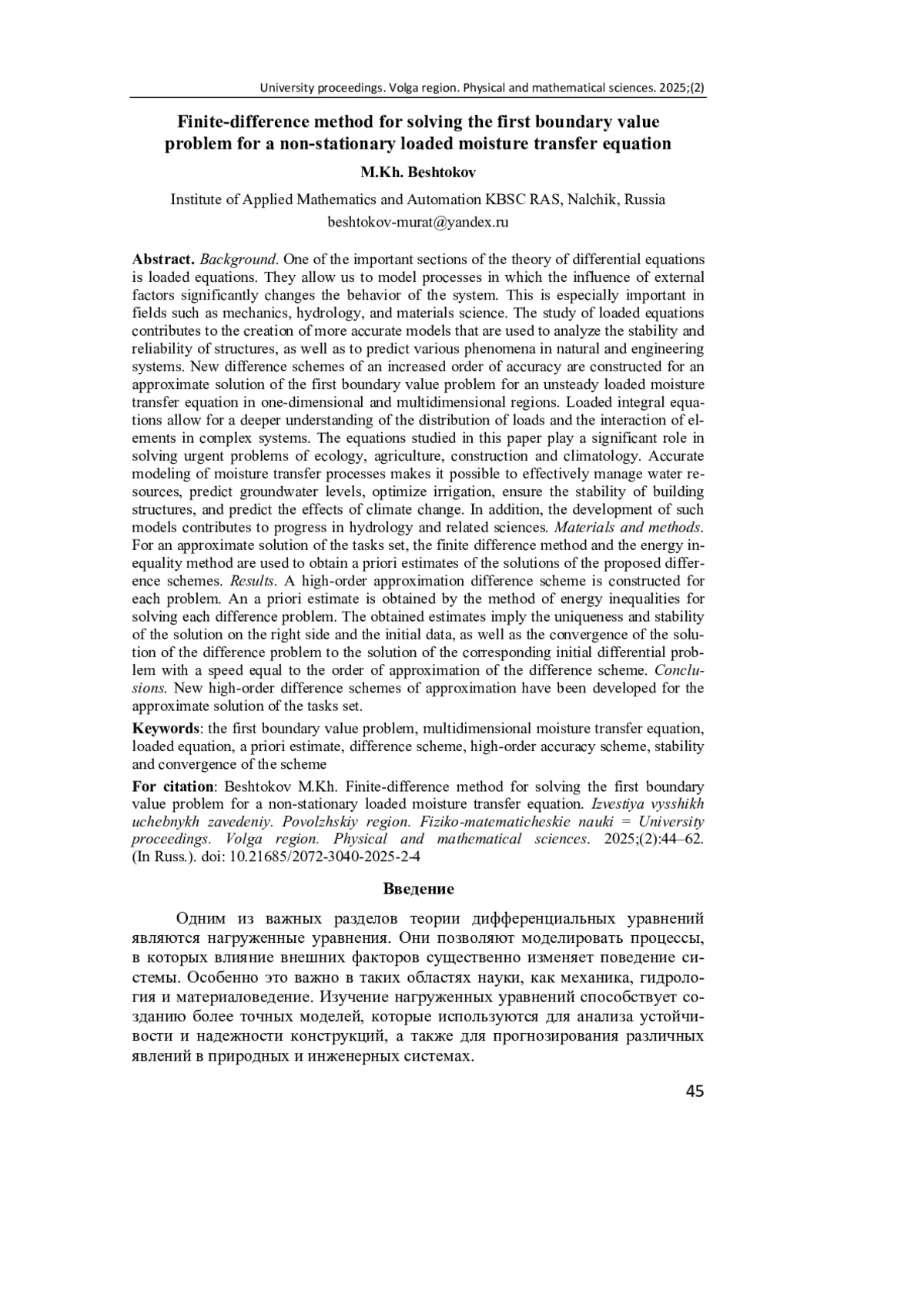 Актуальность и цели. Одним из важных разделов теории дифференциальных уравнений являются нагруженные уравнения. Они позволяют моделировать процессы, в которых влияние внешних факторов существенно изменяет поведение системы. Особенно это важно в таких областях, как механика, гидрология и материаловедение. Изучение нагруженных уравнений способствует созданию более точных моделей, которые используются для анализа устойчивости и надежности конструкций, а также для прогнозирования различных явлений в природных и инженерных системах. Построены новые разностные схемы повышенного порядка точности для приближенного решения первой краевой задачи для нестационарного нагруженного уравнения влагопереноса в одномерных и многомерных областях. Нагруженные интегральные уравнения позволяют глубже понять распределение нагрузок и взаимодействие элементов в сложных системах. Изученные в данной работе уравнения играют значительную роль в решении актуальных задач экологии, сельского хозяйства, строительства и климатологии. Точное моделирование процессов влагопереноса позволяет эффективно управлять водными ресурсами, прогнозировать уровень грунтовых вод, оптимизировать орошение, обеспечивать устойчивость строительных конструкций и предсказывать последствия климатических изменений. Кроме того, развитие таких моделей способствует прогрессу в гидрологии и смежных науках.