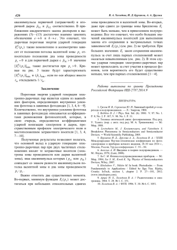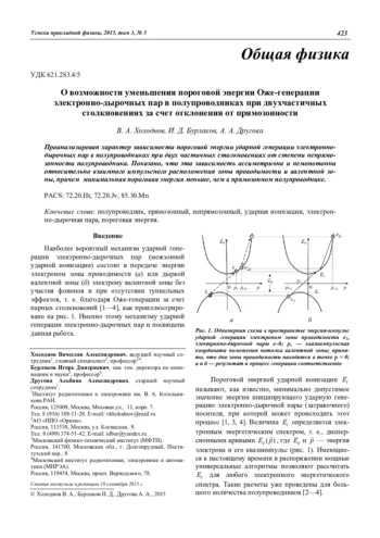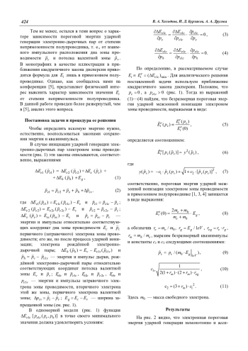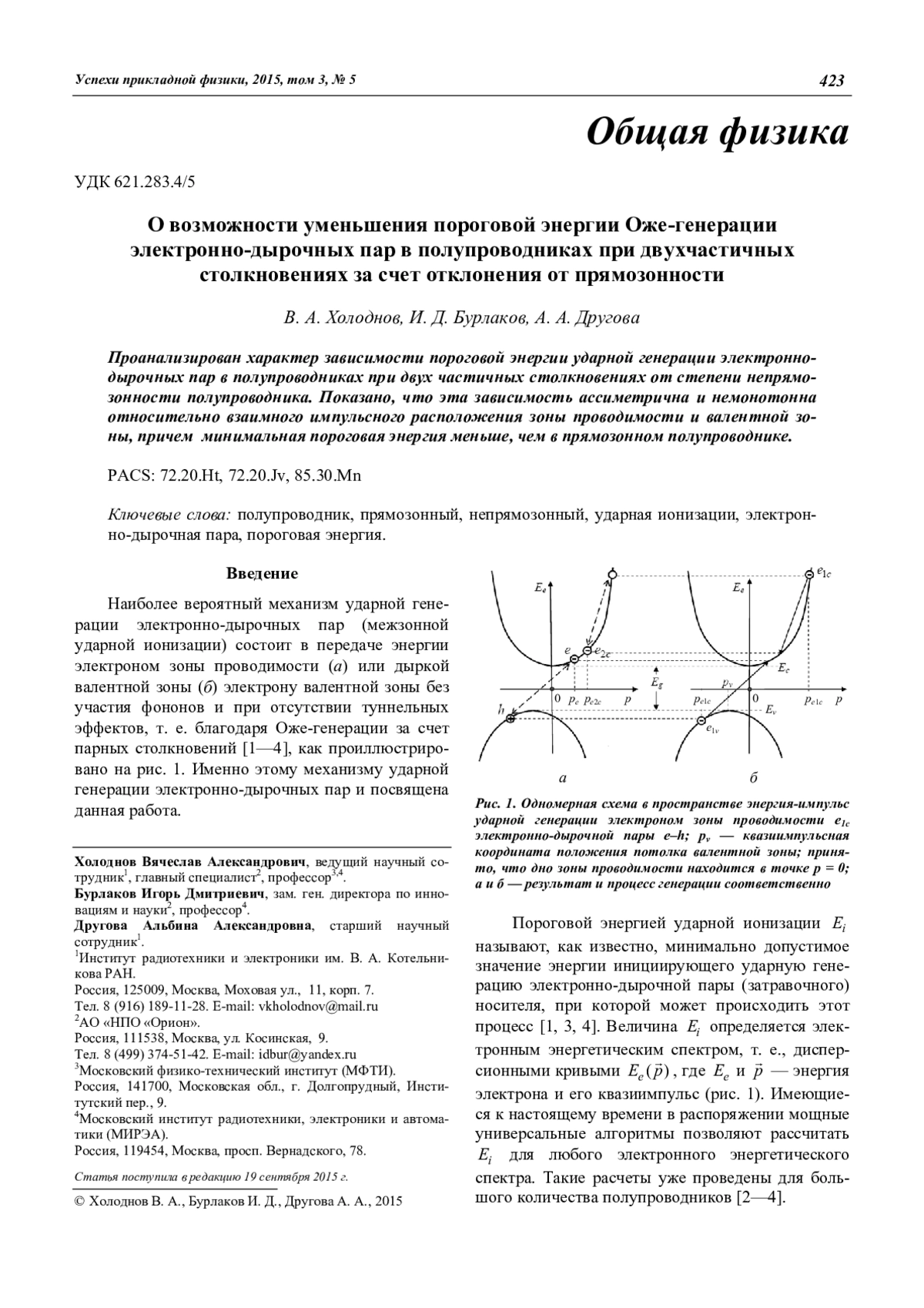 Холоднов В. А., Бурлаков И. Д., Другова А. А. О возможности уменьшения пороговой энергии Ожегенерации электронно-дырочных пар в полупроводниках при двухчастичных столкновениях за счет отклонения от прямозонности 423