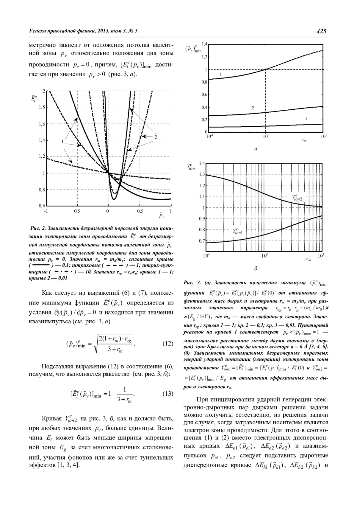 Важно отметить два существенных момента. Во-первых, минимум функции Ei ( pv ) может достигаться при небольших относительных сдвигах зоны проводимости и валентной зоны. Во-вторых, даже при сдвиге до границы зоны Бриллюэна Ei может быть меньше, чем в прямозонном полупроводнике. Все это означает, что особо больших значений квазиимпульса носителей для выполнения закона его сохранения в экстремальных точках зависимостей Ei ( pv ) (см. рис. 2) не требуется. При больших значениях Ei закон сохранения квазиимпульса за счет лишь парных столкновений может оказаться невыполнимым (см. рис. 2). В этом случае ударная генерация электронно-дырочных пар может происходить за счет участия в процессе фононов, хотя вероятность его будет существенно меньше, чем при парных столкновениях [1—4].