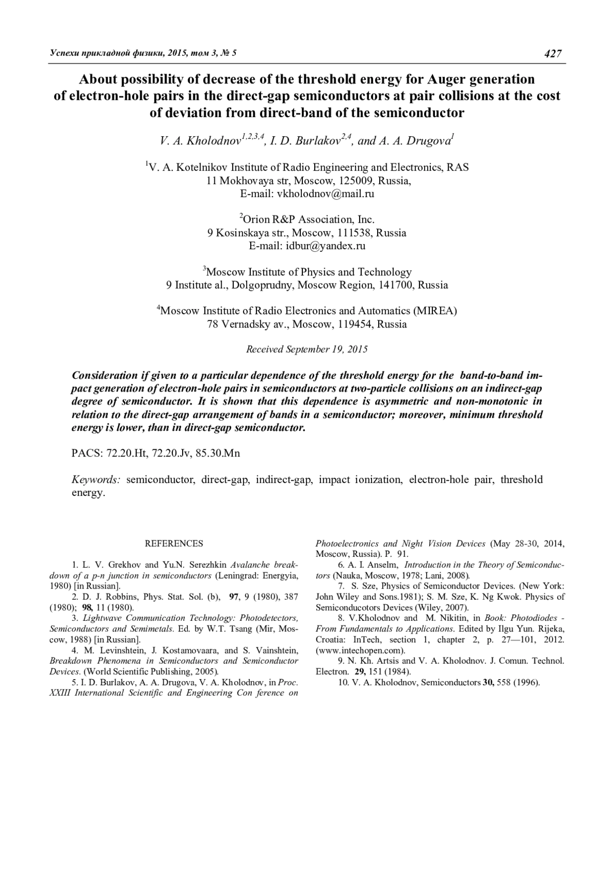 V. A. Kholodnov, I. D. Burlakov, and A. A. Drugova About possibility of decrease of the threshold energy for Auger generation of electron-hole pairs in the direct-gap semiconductors at pair collisions at the cost of deviation from direct-band of the semiconductor 423