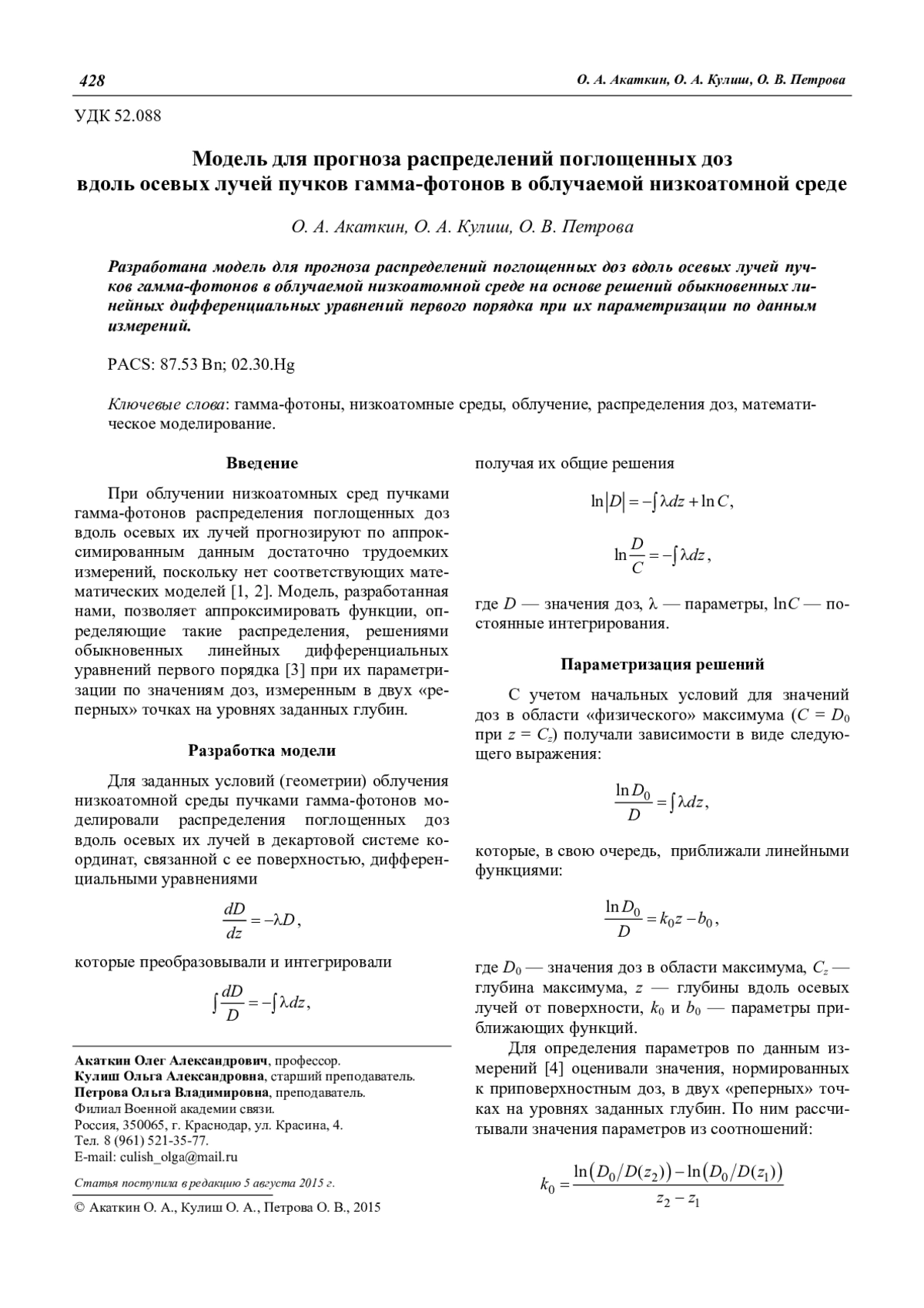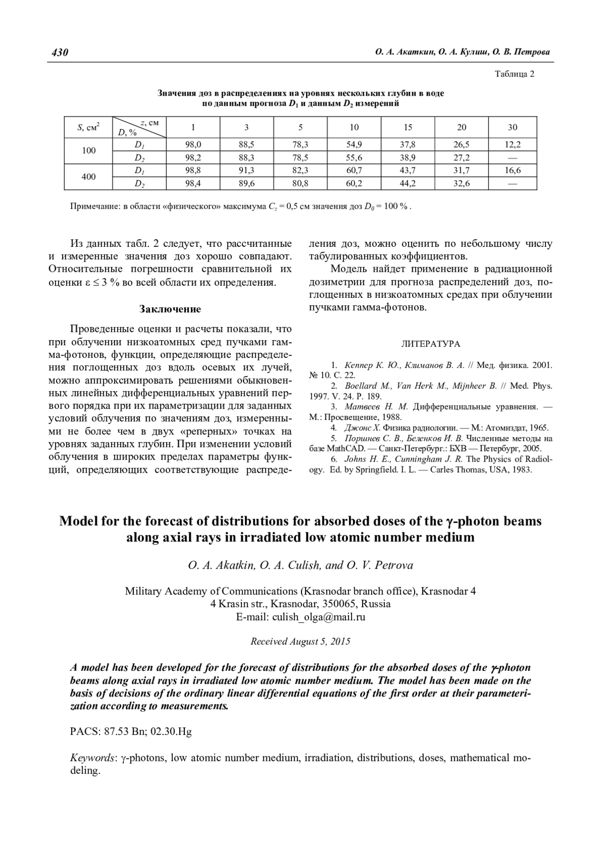 O. A. Akatkin, O. A. Culish, and O. V. Petrova Model for the forecast of distributions for absorbed doses of the -photon beams along axial rays in irradiated low atomic number medium 428
