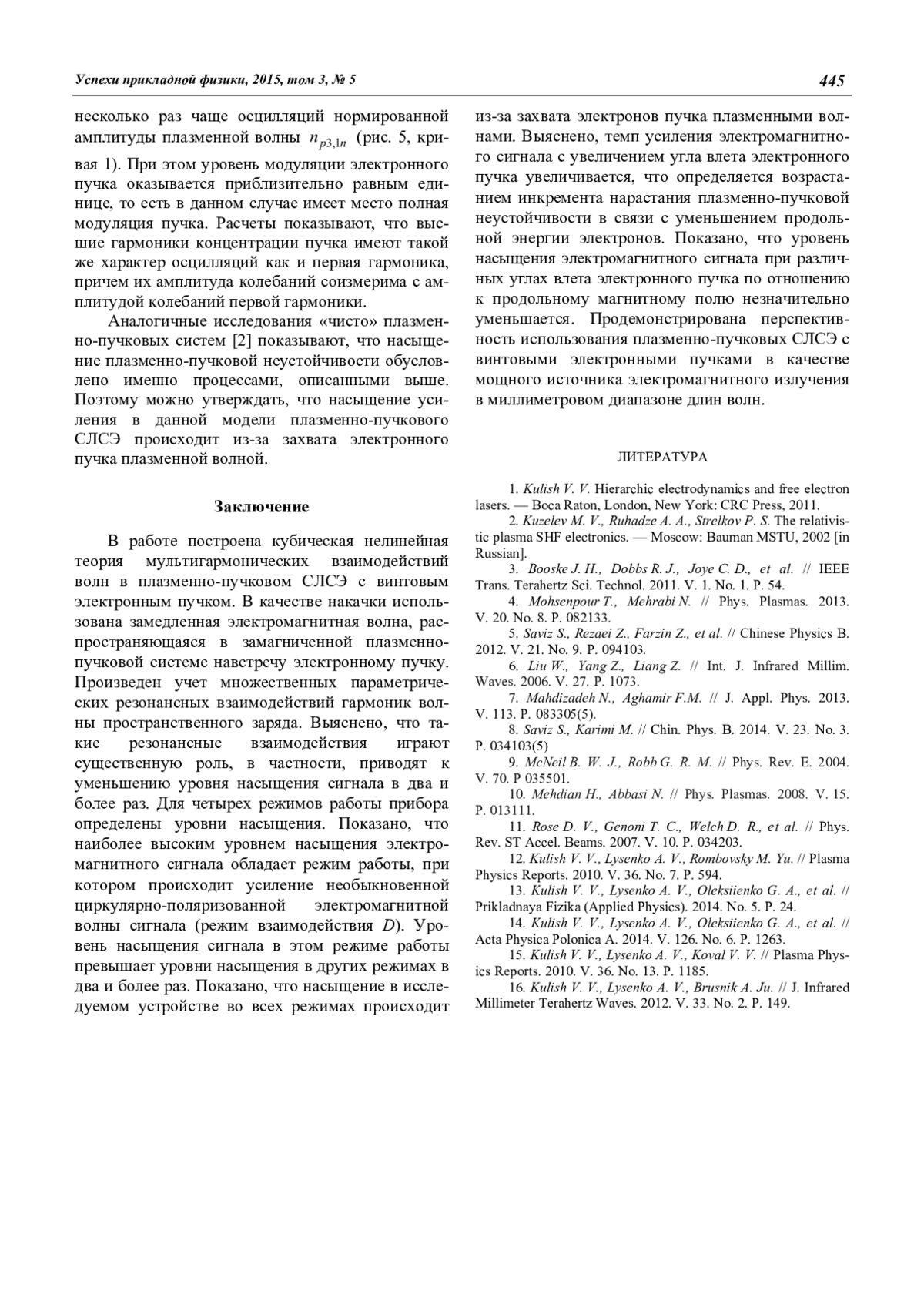 15. Kulish V. V., Lysenko A. V., Koval V. V. // Plasma Physics Reports. 2010. V. 36. No. 13. P. 1185.