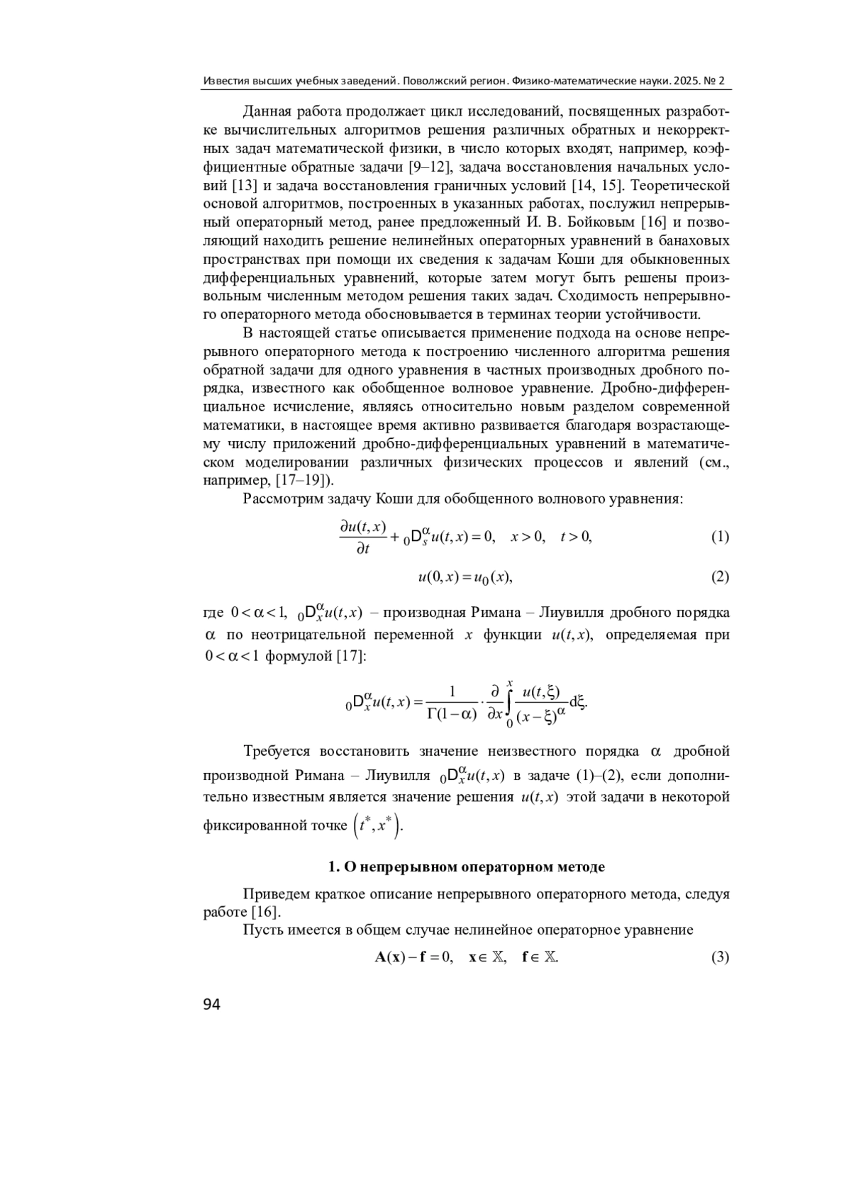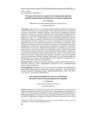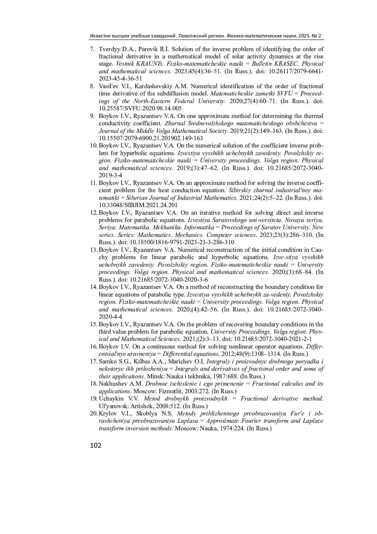 13. Бойков И. В., Рязанцев В. А. Численное восстановление начального условия в задачах Коши для линейных параболических и гиперболических уравнений // Известия высших учебных заведений. Поволжский регион. Физико-математические науки. 2020. № 3. С. 68-84. DOI: 10.21685/2072-3040-2020-3-6 EDN: ZJFRBO