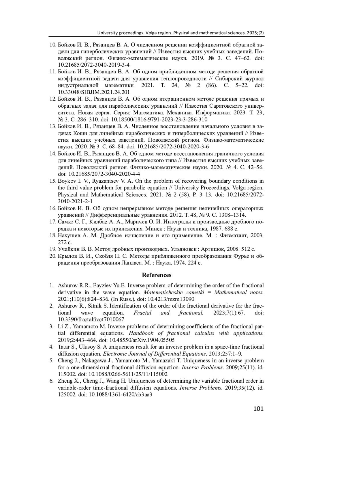 1. Ашуров Р. Р., Файзиев Ю. Э. Обратная задача по определению порядка дробной производной в волновом уравнении // Математические заметки. 2021. Т. 110, № 6. С. 824-836. DOI: 10.4213/mzm13090 EDN: JZSMQZ