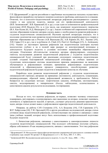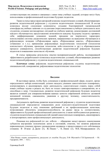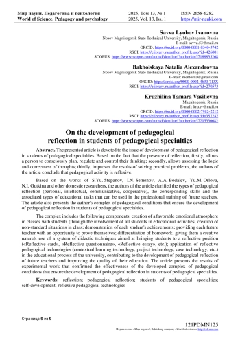 Представленная статья посвящена вопросу развития педагогической рефлексии у студентов педагогических специальностей. Исходя из того, что наличие рефлексии, во-первых, позволяет человеку сознательно планировать, регулировать и контролировать свое мышление; во-вторых, позволяет оценивать логичность и правильности мыслей; в-третьих, улучшает результаты решения практических задач, авторы статьи делают вывод о рефлексивном характере педагогической деятельности. На основе работ С. Ю. Степанова, А. А. Бодалева, Г. И. Саранцева, Ж. Р. Хайруллова, Т. Ф. Ореховой и других отечественных исследователей, авторами статьи были уточнены виды педагогической рефлексии (личностная, интеллектуальная, коммуникативная, кооперативная), соответствующие им умения и связанные с ними типы учебных заданий, которые могут быть использованы в профессиональной подготовке будущих педагогов. Также в статье представлен авторский комплекс педагогических условий, обеспечивающих развитие педагогической рефлексии у студентов педагогических специальностей. В состав комплекса входят следующие компоненты: создание благоприятной эмоциональной атмосферы на учебных занятиях со студентами (через вовлечение в учебную деятельность всех студентов; создание нестандартных ситуаций на учебном занятии; демонстрацию достижений каждого обучающегося; предоставление возможности каждому будущему педагогу проявить себя; дифференциацию домашних заданий, придание им творческого характера); использование системы дидактических приемов, направленных на выведение обучающихся в рефлексивную позицию («Рефлексивная карта, «Рефлексивная анкета», «Рефлексивное сочинение» и т. п.); применение рефлексивных педагогических технологий (технология контекстного обучения, проектная технология, кейс-технология и др.) в образовательном процессе университета, способствующих развитию педагогической рефлексии будущих педагогов и повышению качества их обучения. В статье приведены результаты опытно-экспериментальной работы, подтвердившей эффективность разработанного комплекса педагогических условий, обеспечивающих развитие педагогической рефлексии у студентов педагогических специальностей.