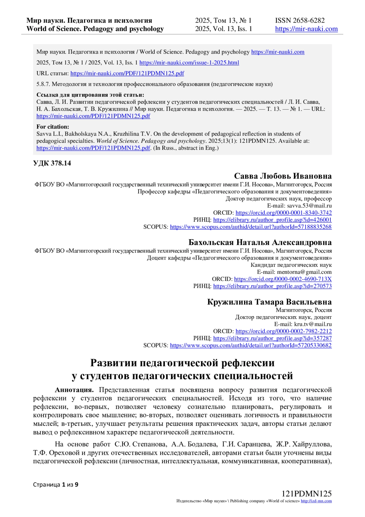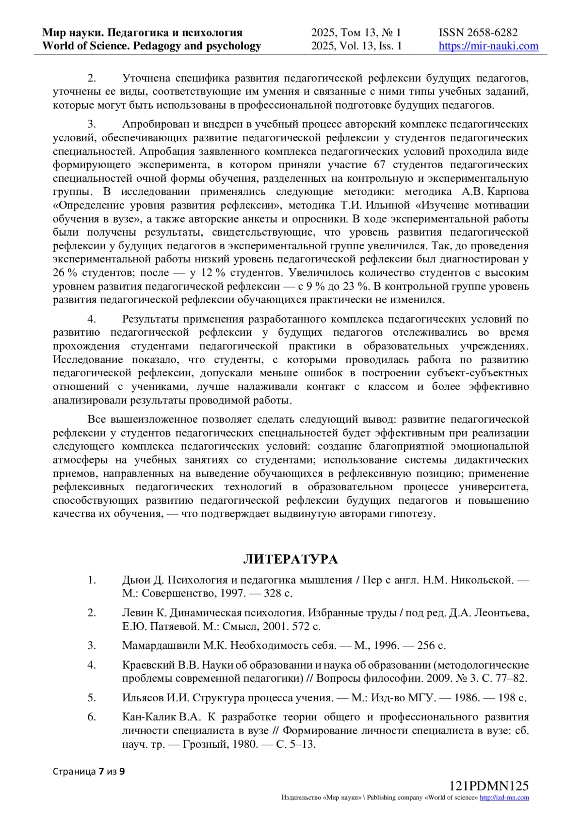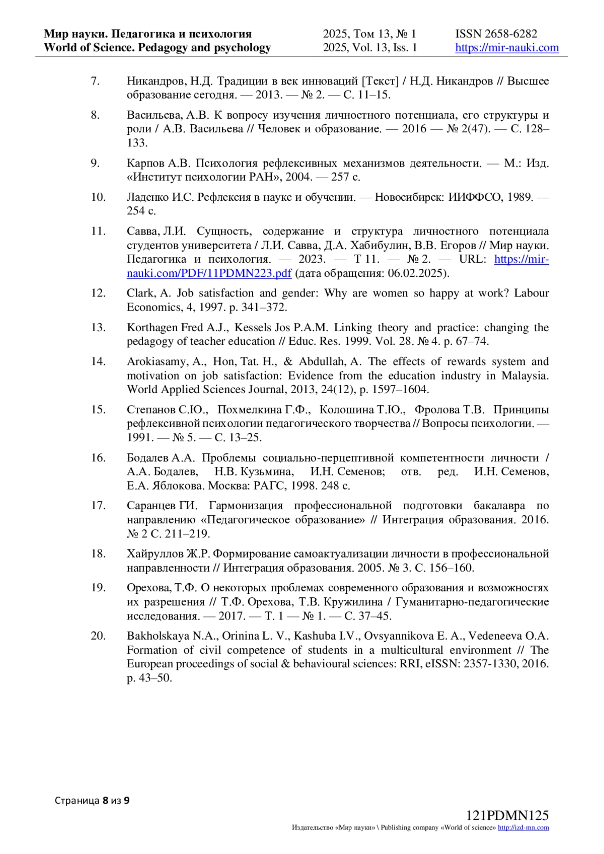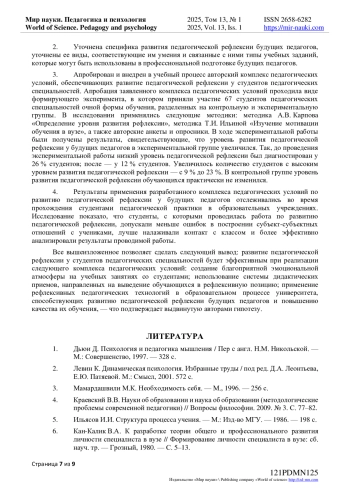 11. Савва, Л.И. Сущность, содержание и структура личностного потенциала студентов университета / Л.И. Савва, Д.А. Хабибулин, В.В. Егоров // Мир науки. Педагогика и психология. - 2023. - Т 11. - № 2. - URL: https://mir-nauki.com/PDF/11PDMN223.pdf (дата обращения: 06.02.2025). EDN: CGIVTI