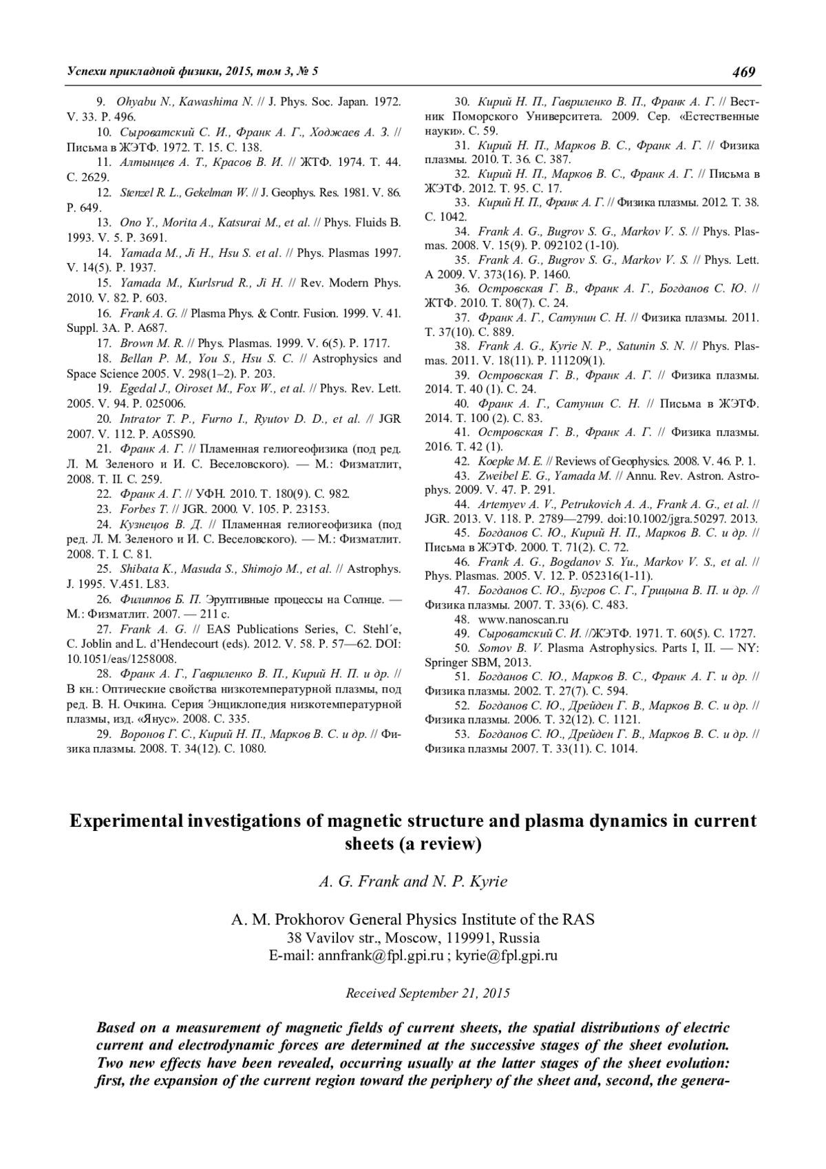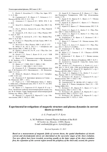A. G. Frank and N. P. Kyrie Experimental investigations of magnetic structure and plasma dynamics in current sheets (a review) 454