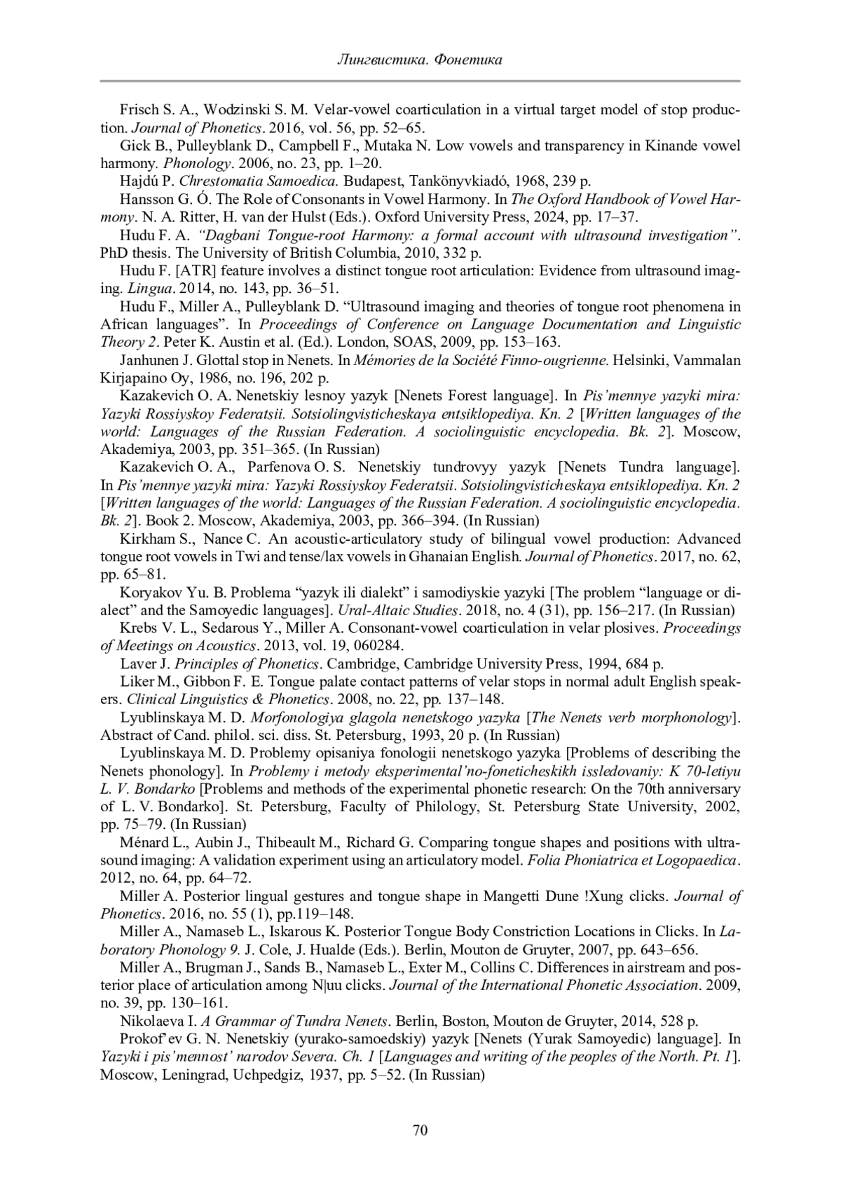 24. Hajdú P. Chrestomatia Samoedica. Budapest: Tankönyvkiadó, 1968. 239 p. Hansson G. Ó. The Role of Consonants in Vowel Harmony // N. A. Ritter, H. van der Hulst (Eds.). The Oxford Handbook of Vowel Harmony. Oxford University Press, 2024. Pp. 17-37.