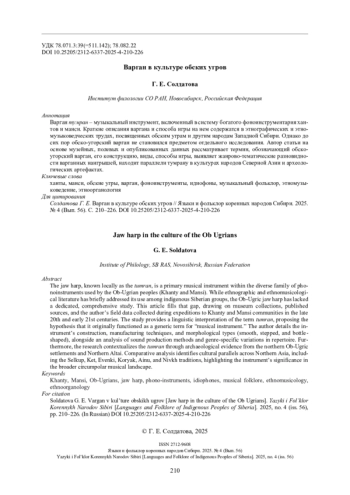 Malakshanova V. B. Vargany evenkov v sobranii Rossiyskogo etnograficheskogo muzeya [Evenki jaw harps in the collection of the Russian Ethnographic Museum]. In Fol’klornoe nasledie ischezayushchikh kul’tur: ot polevykh zapisey do tsifrovykh arkhivov: mat-ly Vseros. nauch.-prakt. konf. s mezhdunar. uchastiem pamyati Yu. I. Sheykina [Folklore heritage of disappearing cultures: from field recordings to digital archives: proceedings of the All-Russian scientific and practical conf. with international participation in memory of Yu. I. Sheikin]. St. Petersburg, Lema, 2025, pp. 144-150. (In Russian).