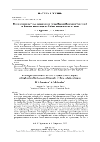 Selyutina I. Ya. Eksperimentalno-foneticheskie dannie po yazikam narodov Sibiri kak istorikolingvisticheskii istochnik [Experimental phonetic data on the languages of the peoples of Siberia as a historical and linguistic source]. Sibirskii Filologicheskii Zhurnal [Siberian Journal of Philology]. 2002, no. 1, pp. 83-102. (In Russian). EDN: GWCMIN