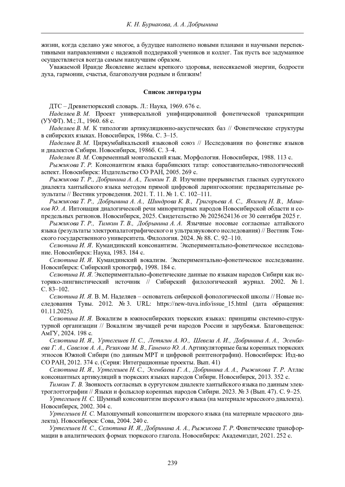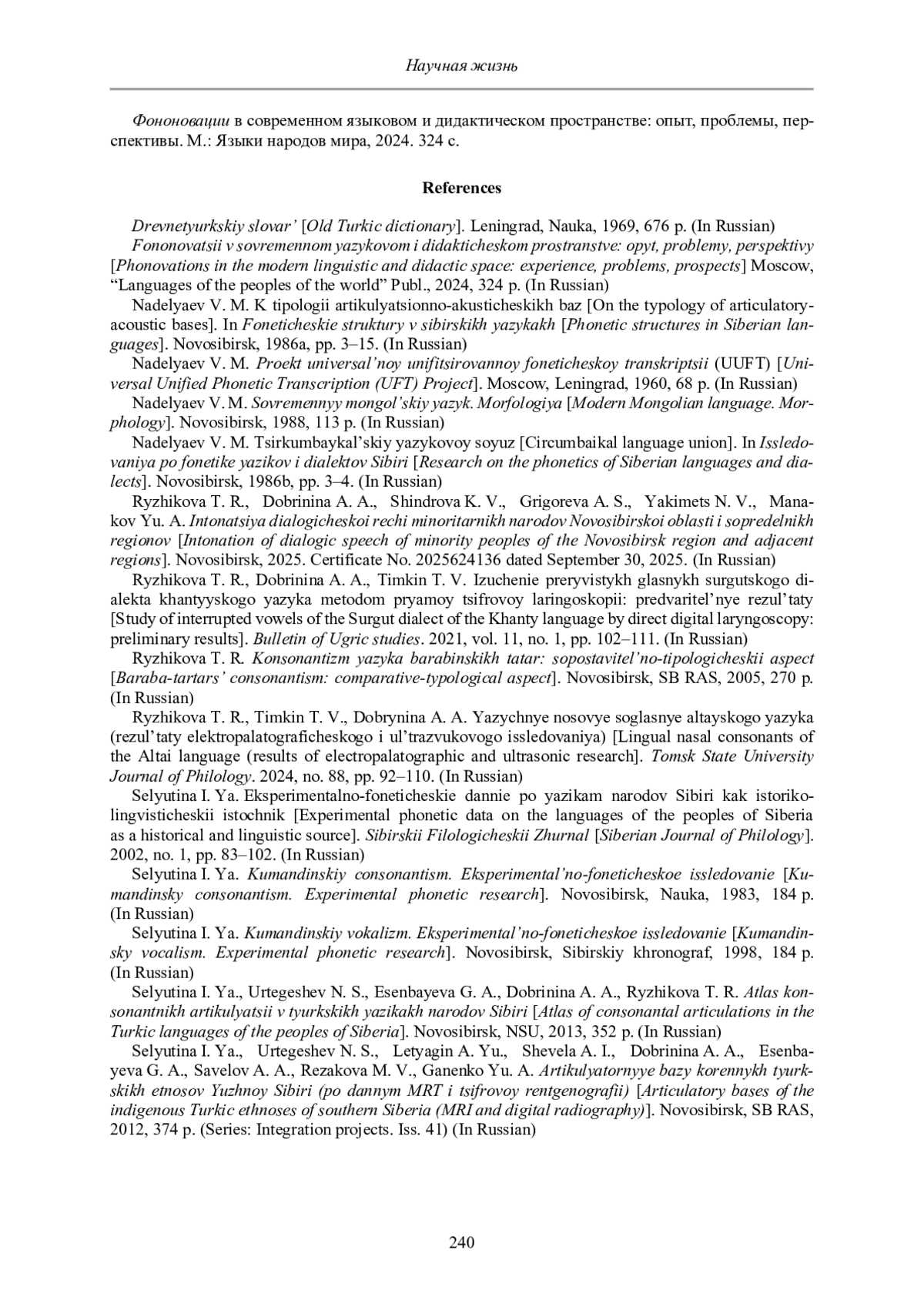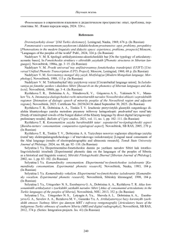 14. Селютина И. Я. Вокализм в южносибирских тюркских языках: принципы системно-структурной организации // Вокализм звучащей речи народов России и зарубежья. Благовещенск: АмГУ, 2024. 198 с.