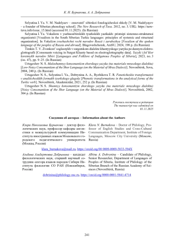 Selyutina I. Ya. Vokalizm v yuzhnosibirskikh tyurkskikh yazikakh: printsipi sistemno-strukturnoi organizatsii [Vocalism in the South Siberian Turkic languages: principles of systemic and structural organization]. In Vokalizm zvuchashchei rechi narodov Rossii i zarubezhya [Vocalism of the spoken language of the peoples of Russia and abroad]. Blagoveshchensk, AmSU, 2024, 198 p. (In Russian).