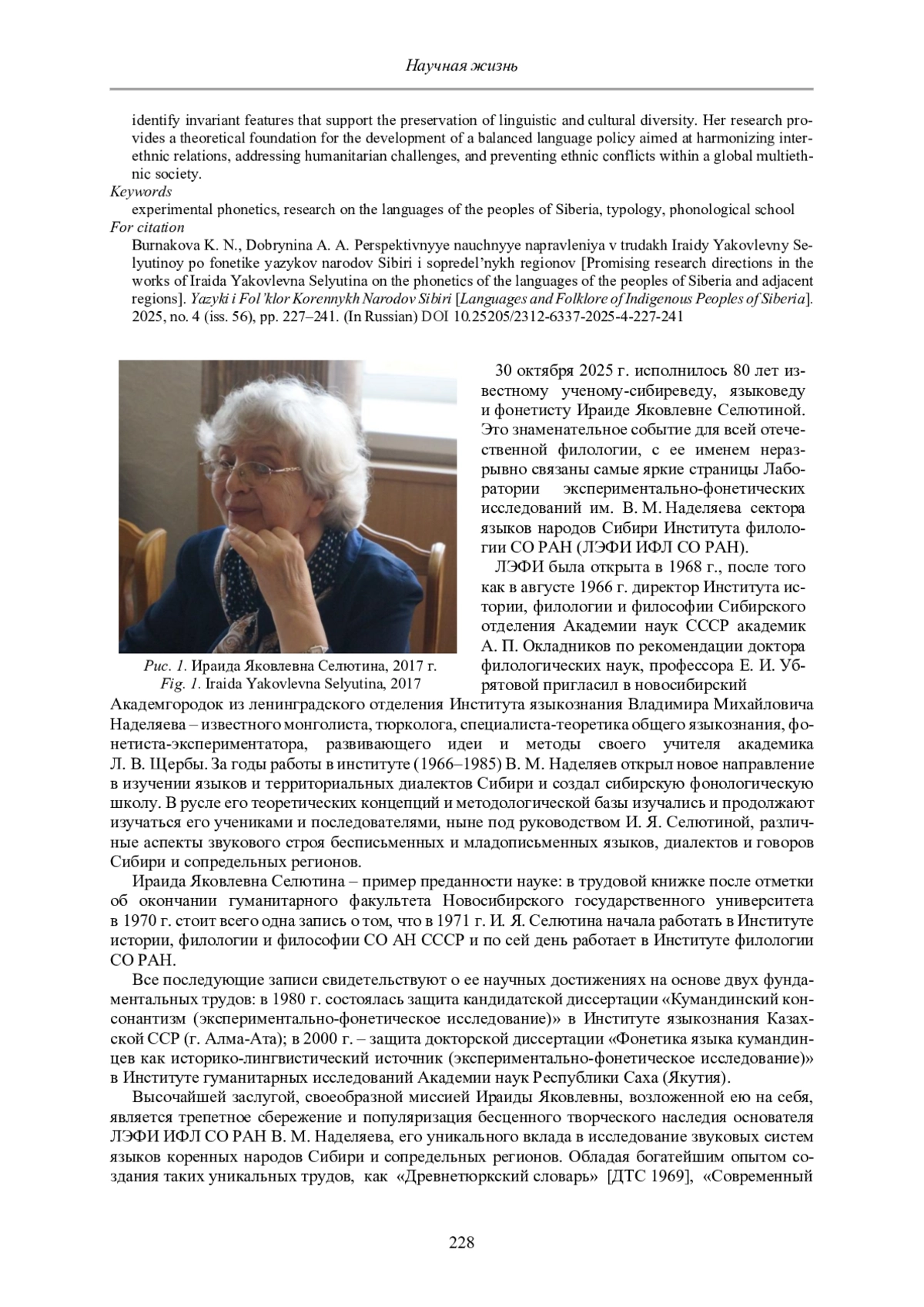 30 октября 2025 г. исполнилось 80 лет известному ученому-сибиреведу, языковеду и фонетисту Ираиде Яковлевне Селютиной. Это знаменательное событие для всей отечественной филологии, с ее именем неразрывно связаны самые яркие страницы Лаборатории экспериментально-фонетических исследований им. В. М. Наделяева сектора языков народов Сибири Института филологии СО РАН (ЛЭФИ ИФЛ СО РАН).