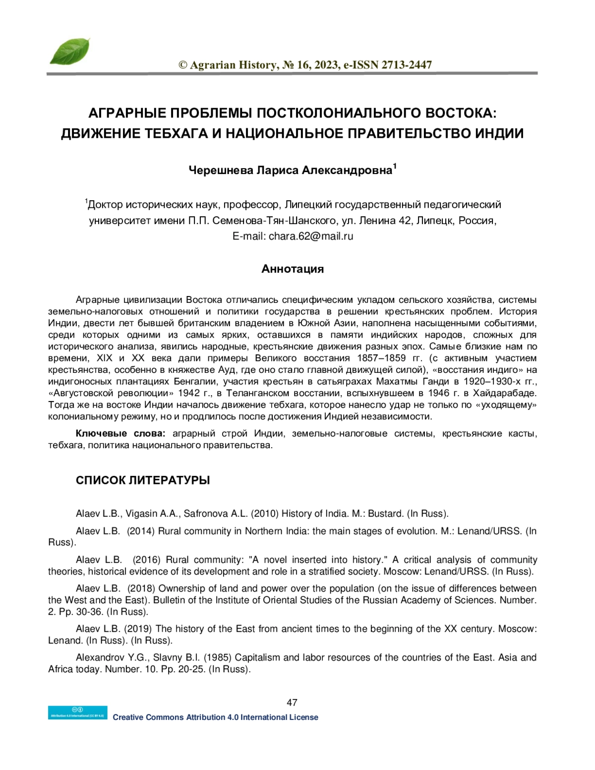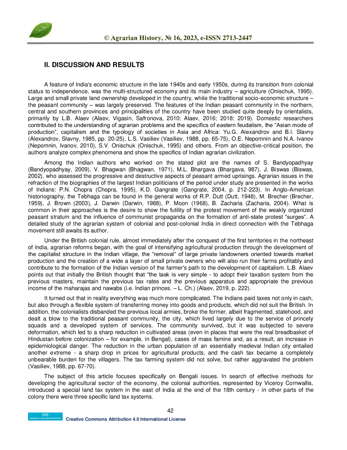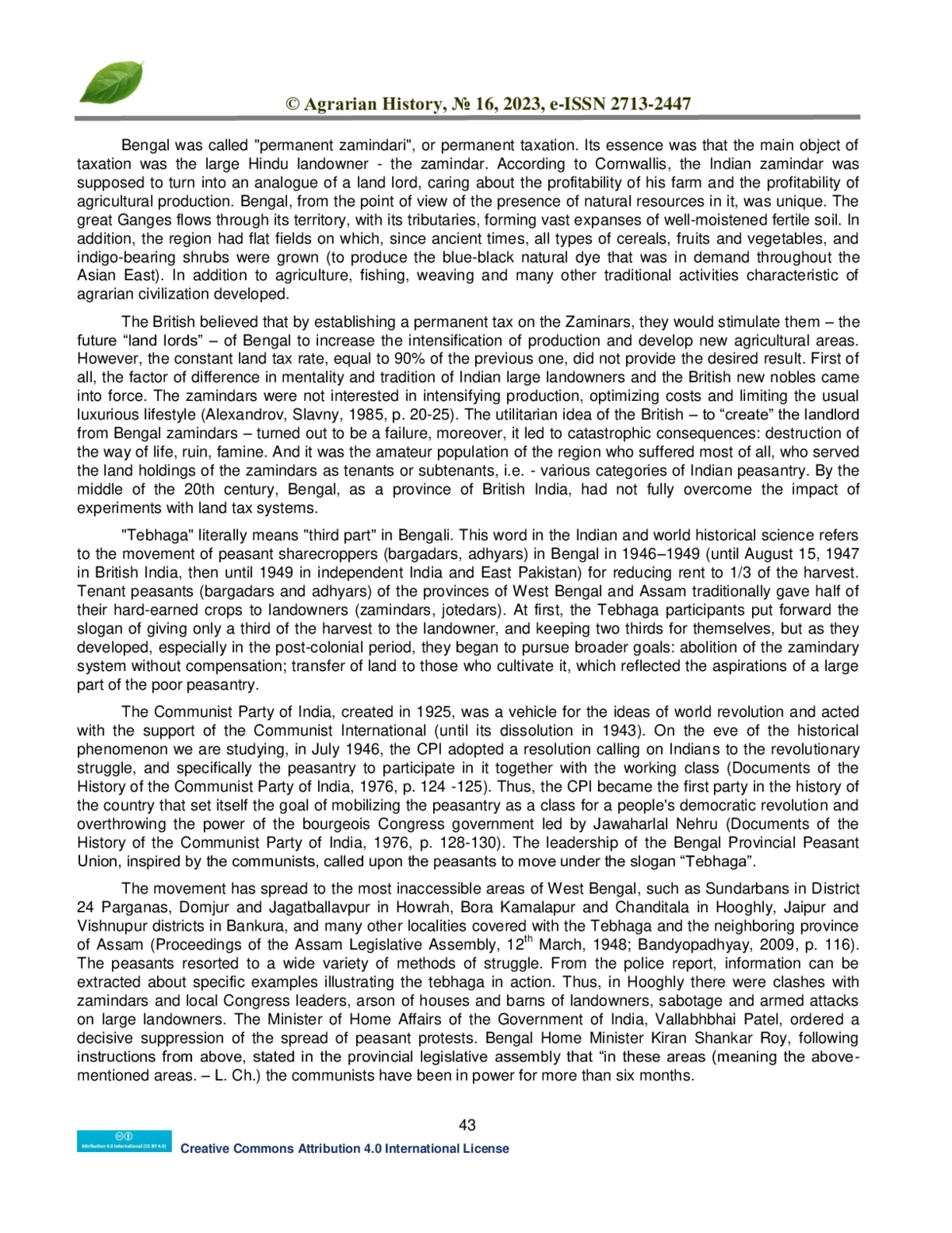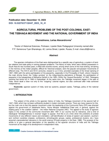 The agrarian civilizations of the East were distinguished by a specific way of agriculture, a system of landtax relations and state policy in solving peasant problems. The history of India, which was a British possession in South Asia for two hundred years, is filled with eventful events, among which some of the most striking, remaining in the memory of the Indian peoples, difficult for historical analysis, were the popular and peasant movements of different eras. The XIX-th and XX-th centuries, closest to us in time, provided examples of the Great Uprising of 1857–1859 (with the active participation of the peasantry, especially in the Principality of Oudh, where it became the main driving force), the “indigo uprising” on the indigo-bearing plantations of Bengal, the participation of peasants in the satyagrahas of Mahatma Gandhi in the 1920–1930s, the “August Revolution” of 1942, Telangana uprising that broke out in 1946 in Hyderabad. At the same time, the Tebhaga movement began in the east of India, which dealt a blow not only to the “outgoing” colonial regime, but also continued after India achieved independence.