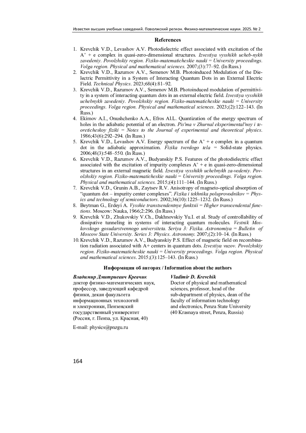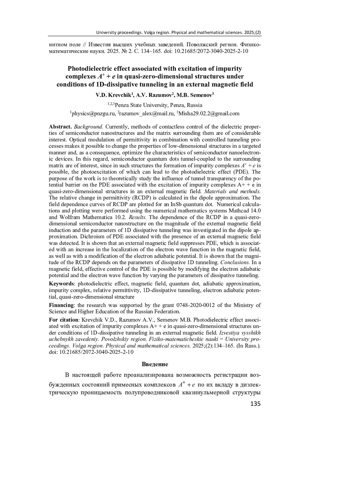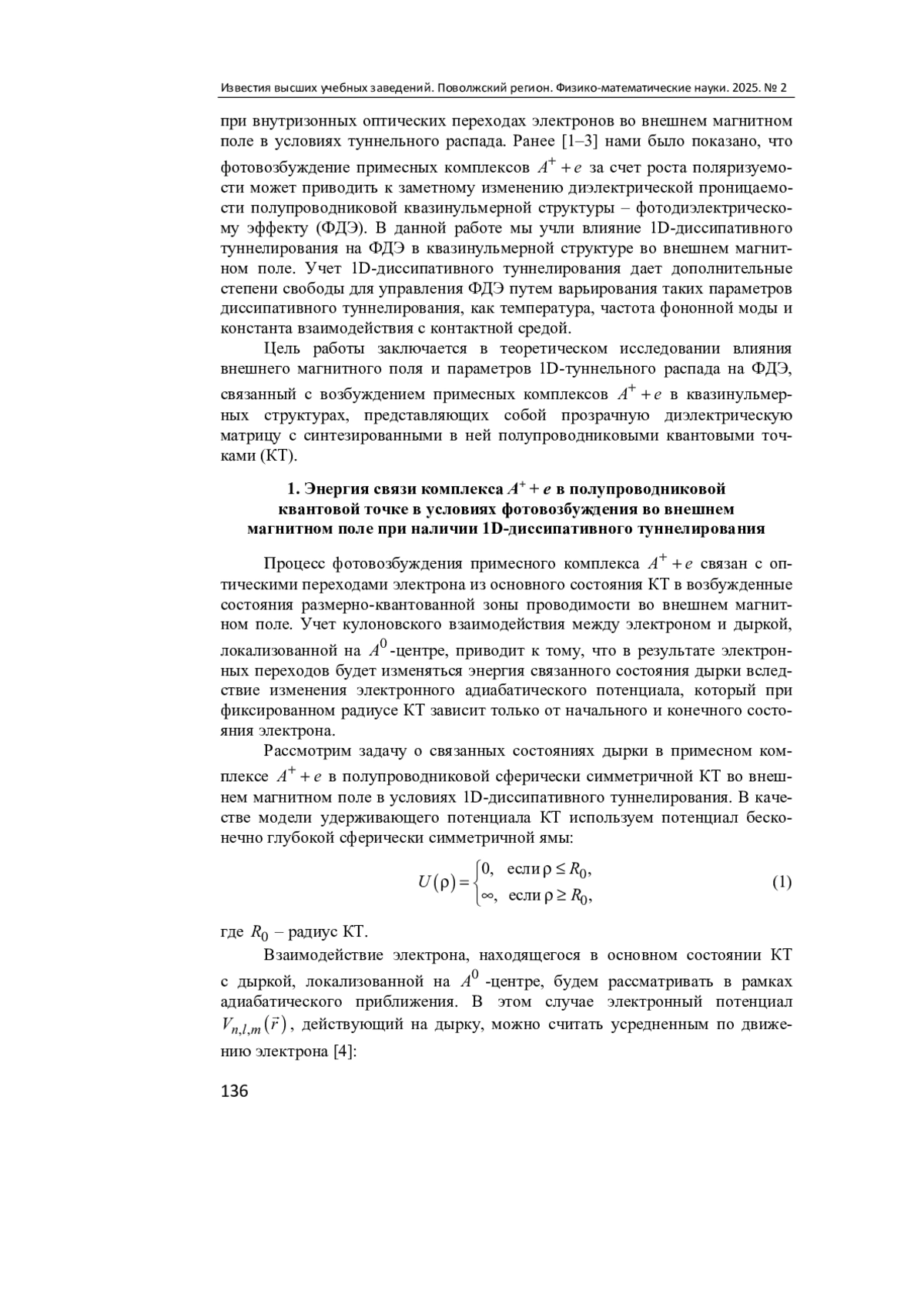 Актуальность и цели. В настоящее время значительный интерес представляют способы бесконтактного управления диэлектрическими свойствами полупроводниковых наноструктур и окружающей их матрицы. Оптическая модуляция диэлектрической проницаемости в сочетании с управляемыми туннельными процессами дают возможность направленного изменения свойств низкоразмерных структур и, как следствие, оптимизации характеристик приборов полупроводниковой наноэлектроники. В этой связи полупроводниковые квантовые точки, туннельно-связанные с окружающей матрицей, представляют интерес, так как в таких структурах возможно образование примесных комплексов A + + e, фотовозбуждение которых может приводить к фотодиэлектрическому эффекту (ФДЭ). Цель работы заключается в теоретическом исследовании влияния туннельной прозрачности потенциального барьера на ФДЭ, связанный с возбуждением примесных комплексов A + + e в квазинульмерных структурах во внешнем магнитном поле.