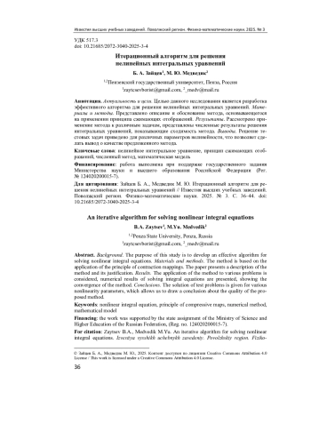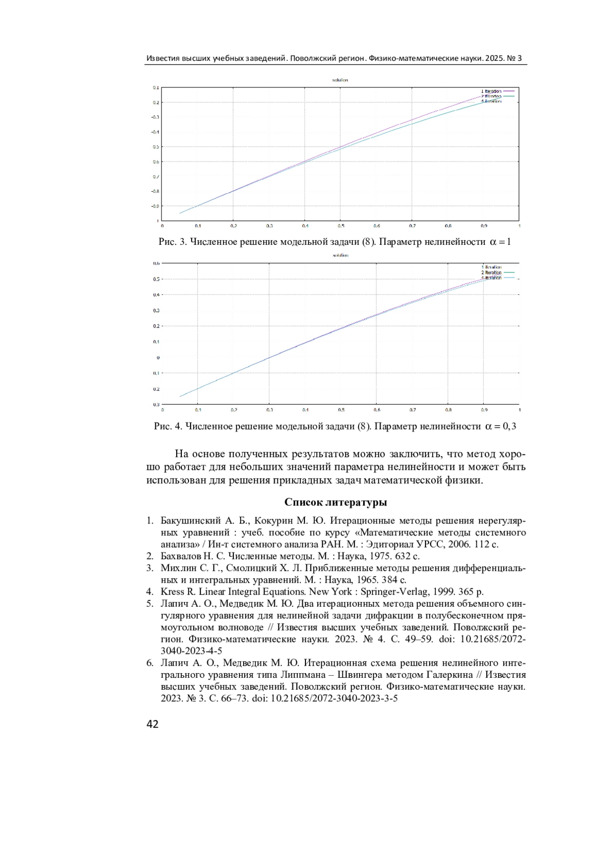 5. Лапич А. О., Медведик М. Ю. Два итерационных метода решения объемного сингулярного уравнения для нелинейной задачи дифракции в полубесконечном прямоугольном волноводе // Известия высших учебных заведений. Поволжский регион. Физико-математические науки. 2023. № 4. С. 49-59. DOI: 10.21685/2072-3040-2023-4-5 EDN: IRQQAD