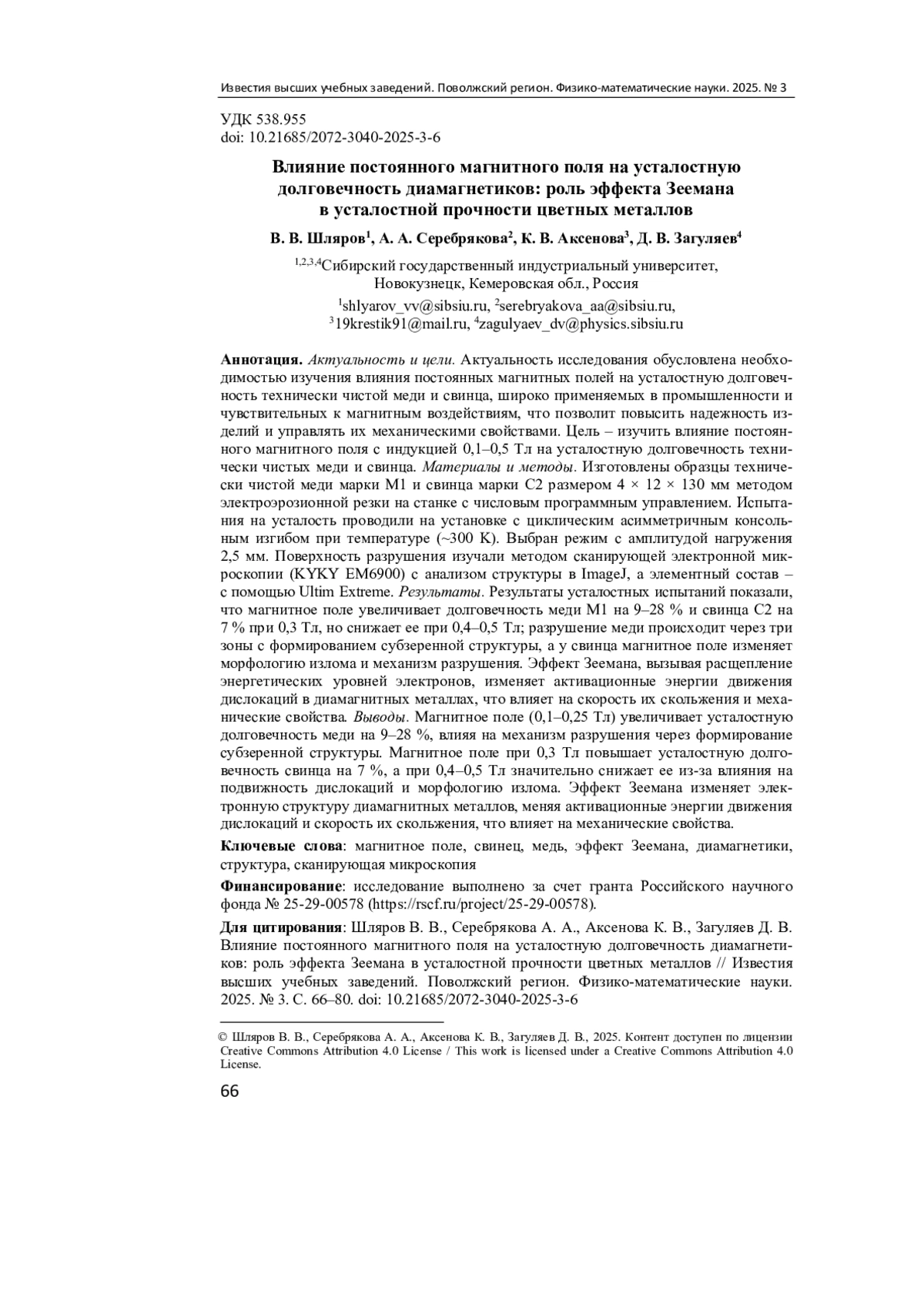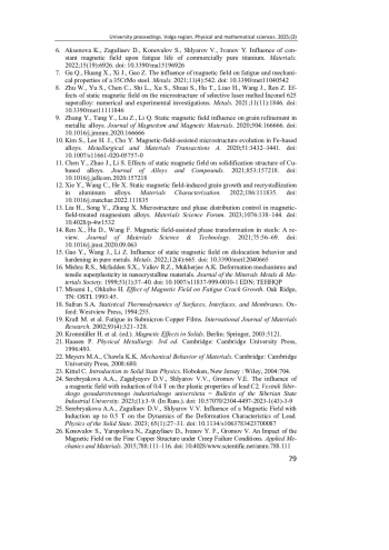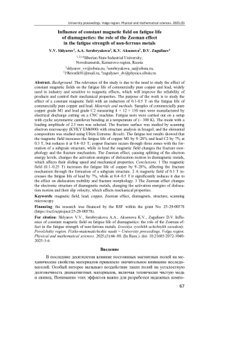 1. Li Q., Zhang Y., Zhao H. Influence of static magnetic field on fatigue damage evolution in copper alloys // Materials Science and Engineering A. 2020. Vol. 785. P. 139431. DOI: 10.1016/j.msea.2020.139431