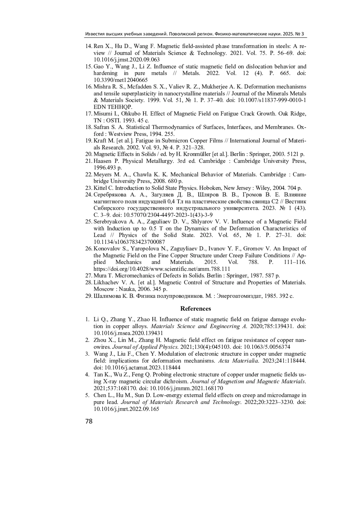 15. Gao Y., Wang J., Li Z. Influence of static magnetic field on dislocation behavior and hardening in pure metals // Metals. 2022. Vol. 12 (4). P. 665. DOI: 10.3390/met12040665 EDN: HIKMWD