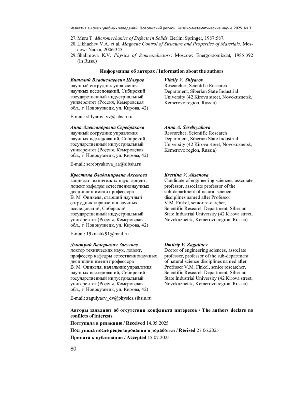 25. Serebryakova A. A., Zaguliaev D. V., Shlyarov V. V. Influence of a Magnetic Field with Induction up to 0.5 T on the Dynamics of the Deformation Characteristics of Lead // Physics of the Solid State. 2023. Vol. 65, № 1. P. 27-31. DOI: 10.1134/s1063783423700087 EDN: TBWXHC