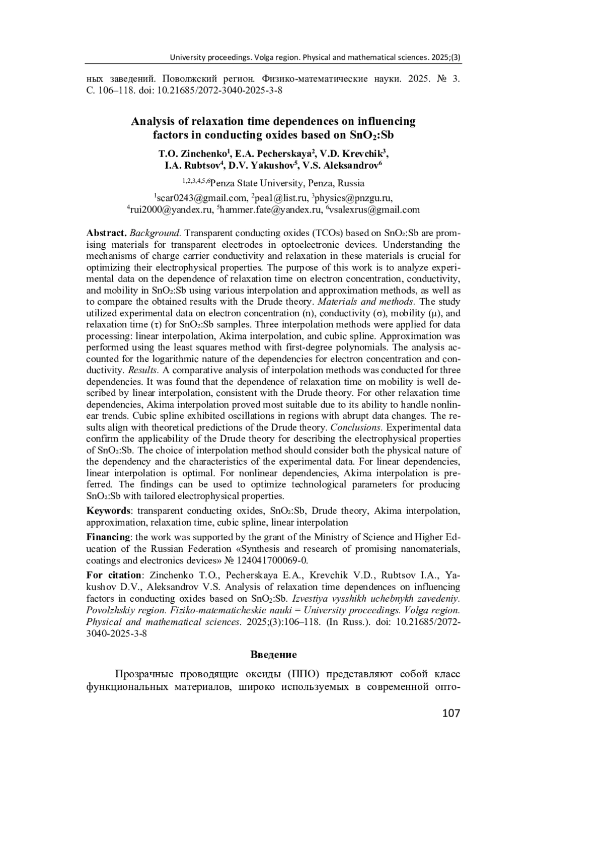 Материалы и методы. Использованы результаты экспериментальных данных об электрофизических параметрах для образцов SnO₂: Sb, в том числе концентрации электронов ( n ), проводимости (σ), подвижности (μ) и времени релаксации (τ). Для обработки данных применены три метода интерполяции: линейная интерполяция, интерполяция Акимы и кубический сплайн. Аппроксимация осуществлена методом наименьших квадратов с использованием полиномов первой степени.