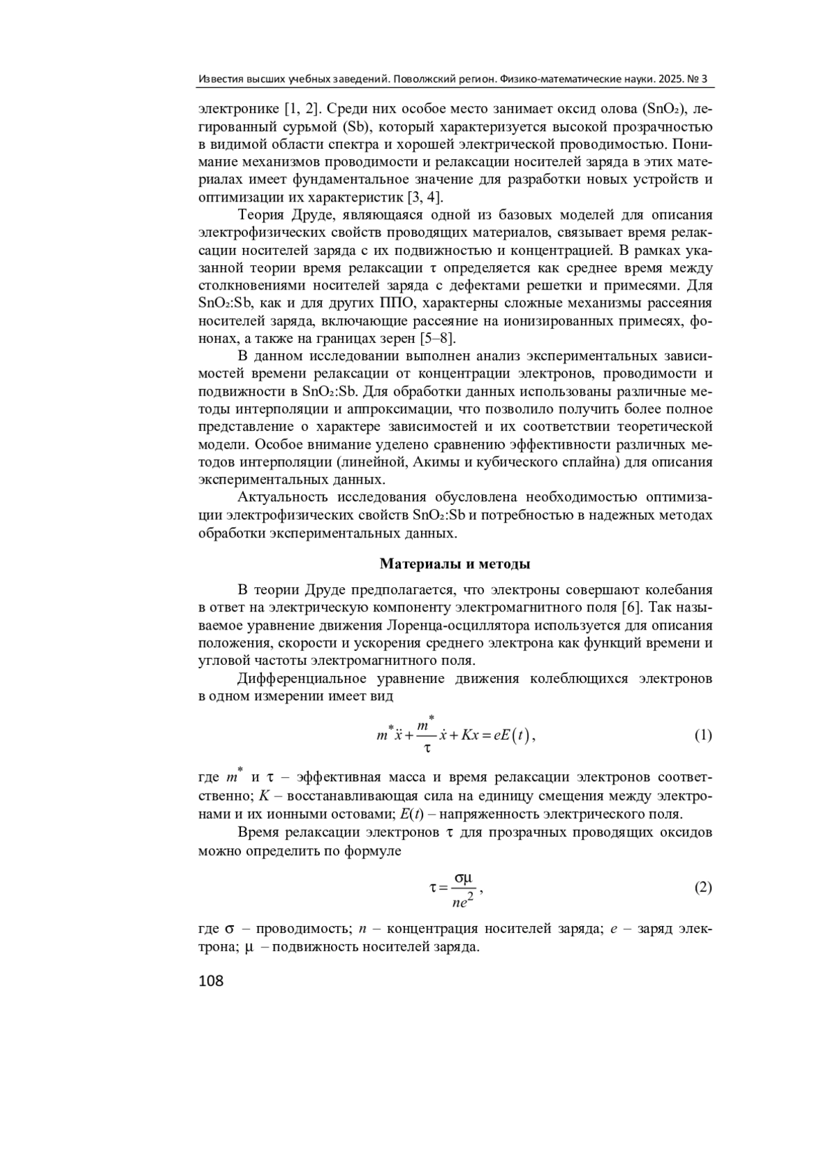 Актуальность и цели. Прозрачные проводящие оксиды на основе SnO₂: Sb представляют собой перспективный материал для создания прозрачных электродов в оптоэлектронных устройствах. Понимание механизмов проводимости и релаксации носителей заряда в этих материалах имеет большое значение для оптимизации их электрофизических свойств. Целью исследования является анализ зависимостей времени релаксации от концентрации электронов, проводимости и подвижности в SnO₂: Sb на основе использования различных методов интерполяции и аппроксимации, а также сопоставление полученных результатов с теорией Друде.