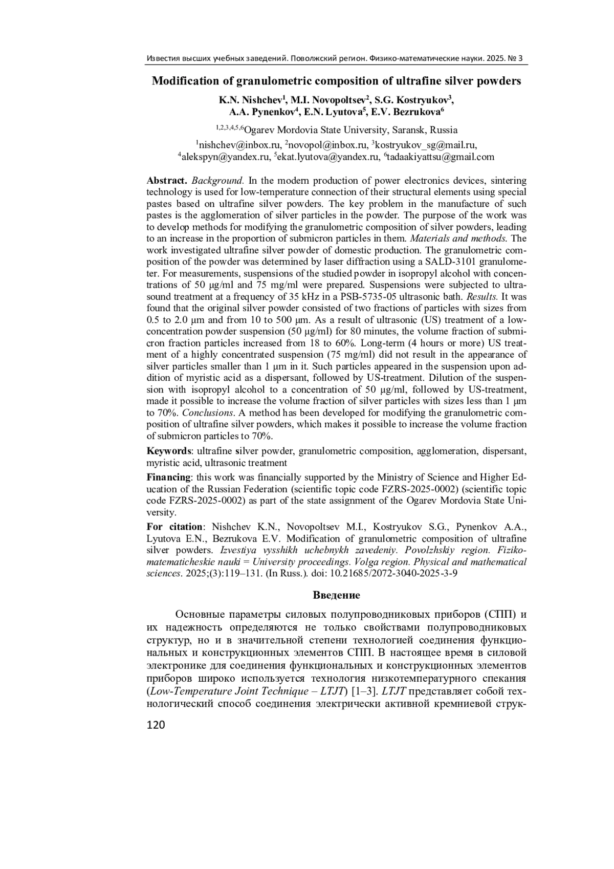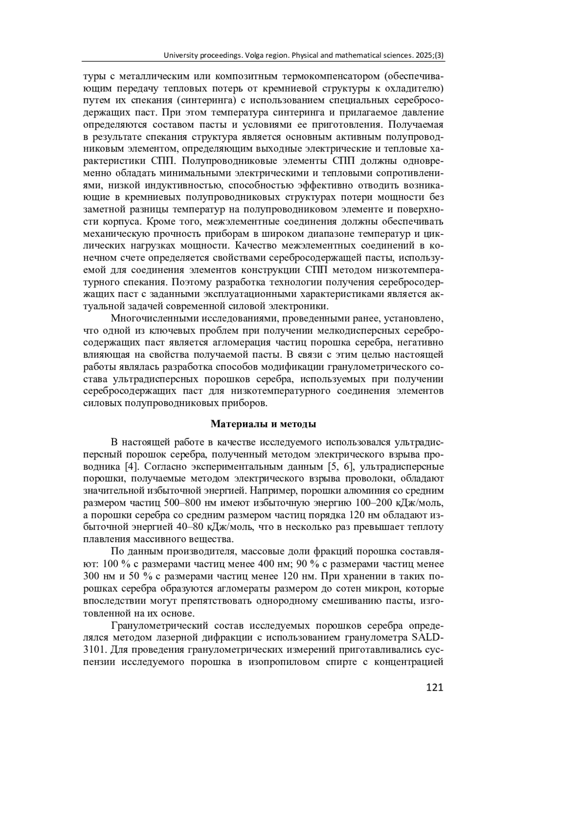 Актуальность и цели. В современном производстве приборов силовой электроники для низкотемпературного соединения их конструкционных элементов применяется технология спекания (синтеринга) с использованием специальных паст на основе ультрадисперсных порошков серебра. Ключевой проблемой при изготовлении таких паст является агломерация частиц серебра в порошке. Цель - разработка способов модификации гранулометрического состава порошков серебра, приводящих к увеличению в них доли субмикронных частиц.