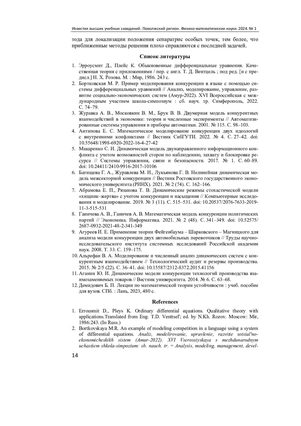 2. Бортковская М. Р. Пример моделирования конкуренции в языке с помощью системы дифференциальных уравнений // Анализ, моделирование, управление, развитие социально-экономических систем (Амур-2022). XVI Всероссийская с международным участием школа-симпозиум: сб. науч. тр. Симферополь, 2022. С. 74-79. EDN: UKHWLI
