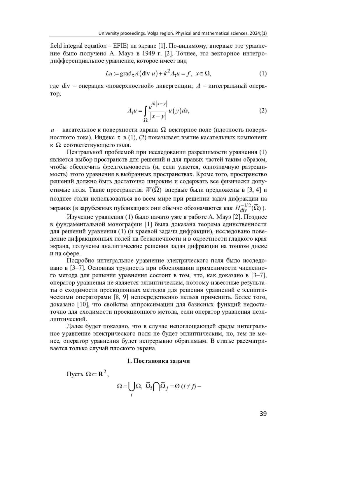 Наиболее естественный подход к решению задачи дифракции электромагнитного поля на идеально проводящем тонком ограниченном экране – сведение ее к решению интегрального уравнения электрического поля (electric field integral equation – EFIE) на экране [1]. По-видимому, впервые это уравнение было получено А. Мауэ в 1949 г. [2].